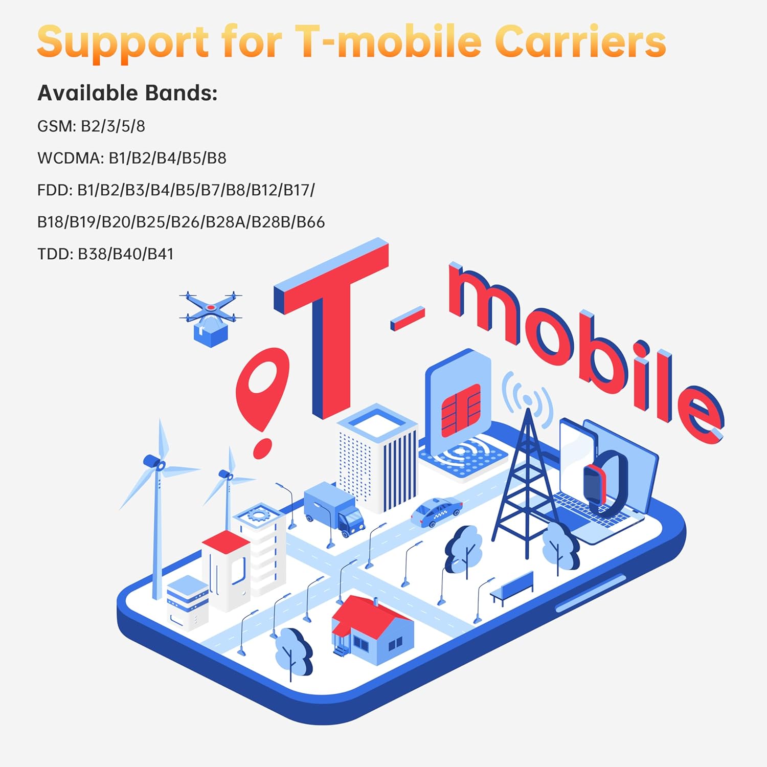 【Tips】Ensure LTE functionality is enabled on your OUKITEL G5 unlocked rugged phones. It supports T-Mobile but not AT&T SIM cards. Specific frequency bands include GSM: B2/3/5/8; WCDMA: B1/B2/B4/B5/B8; FDD:B1/B2/B3/B4/B5/B7/B8/B12/B17/B18/B19/B20/B25/B26/B28A/B28B/B66; TDD: B38/39/40/41