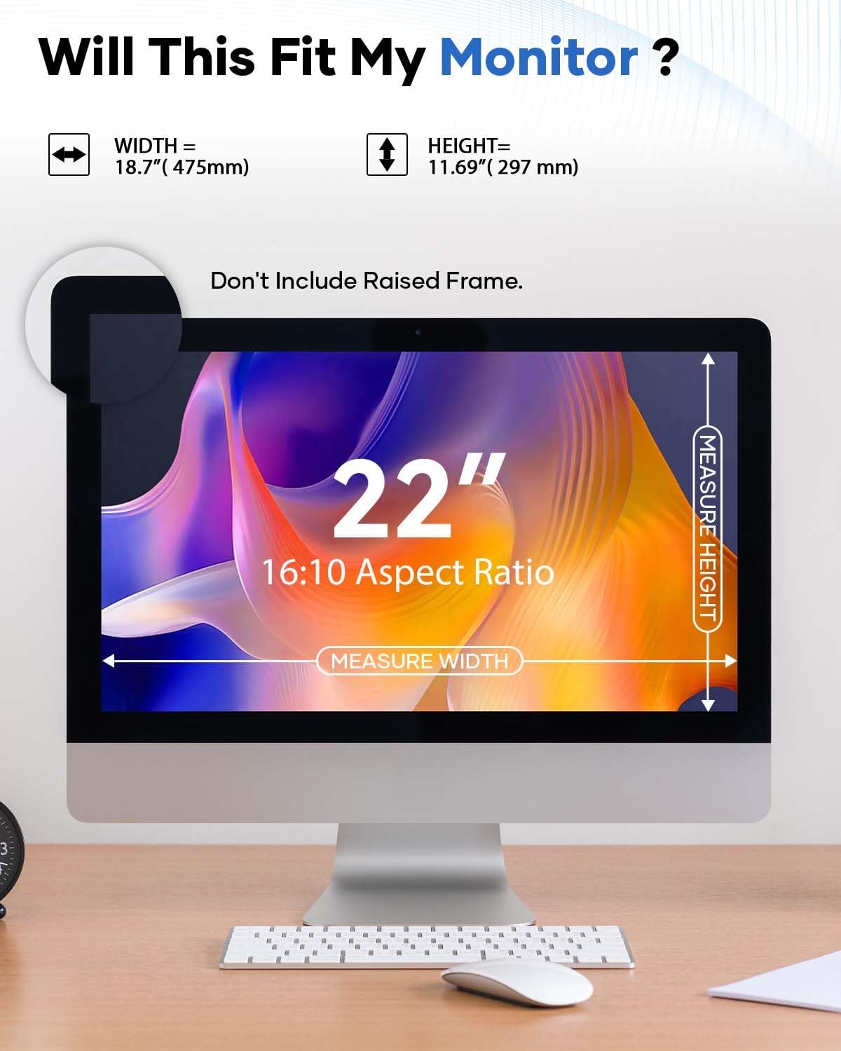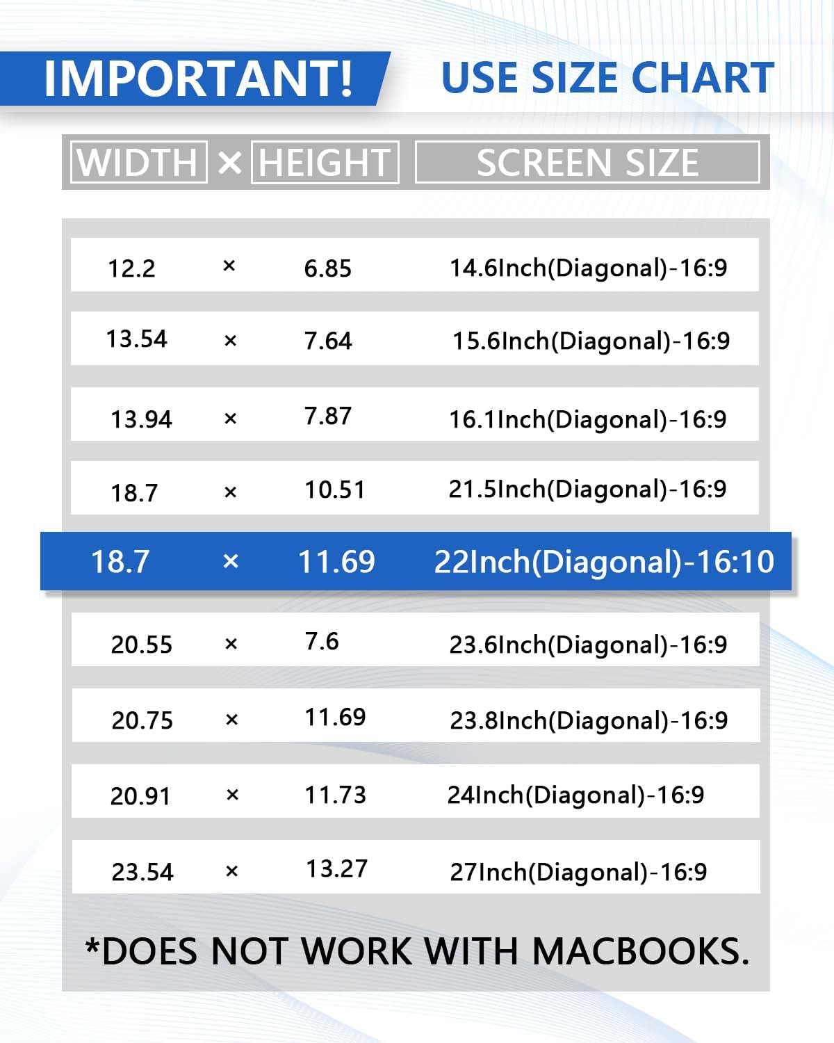 【22 Inch Privacy Protection Film Size】Width: 18 inches (18.7 inches/475 mm), height: 11 inches (11.69 inches/297 mm) -16:10 aspect ratio. This computer privacy protection film can be seamlessly adapted. Support most mainstream models on the market. In order to ensure the best user experience, it is recommended to carefully measure the width and height of the screen before placing an order. If you have any questions about the size, please contact us. It is not recommended to choose the size only according to the diagonal.