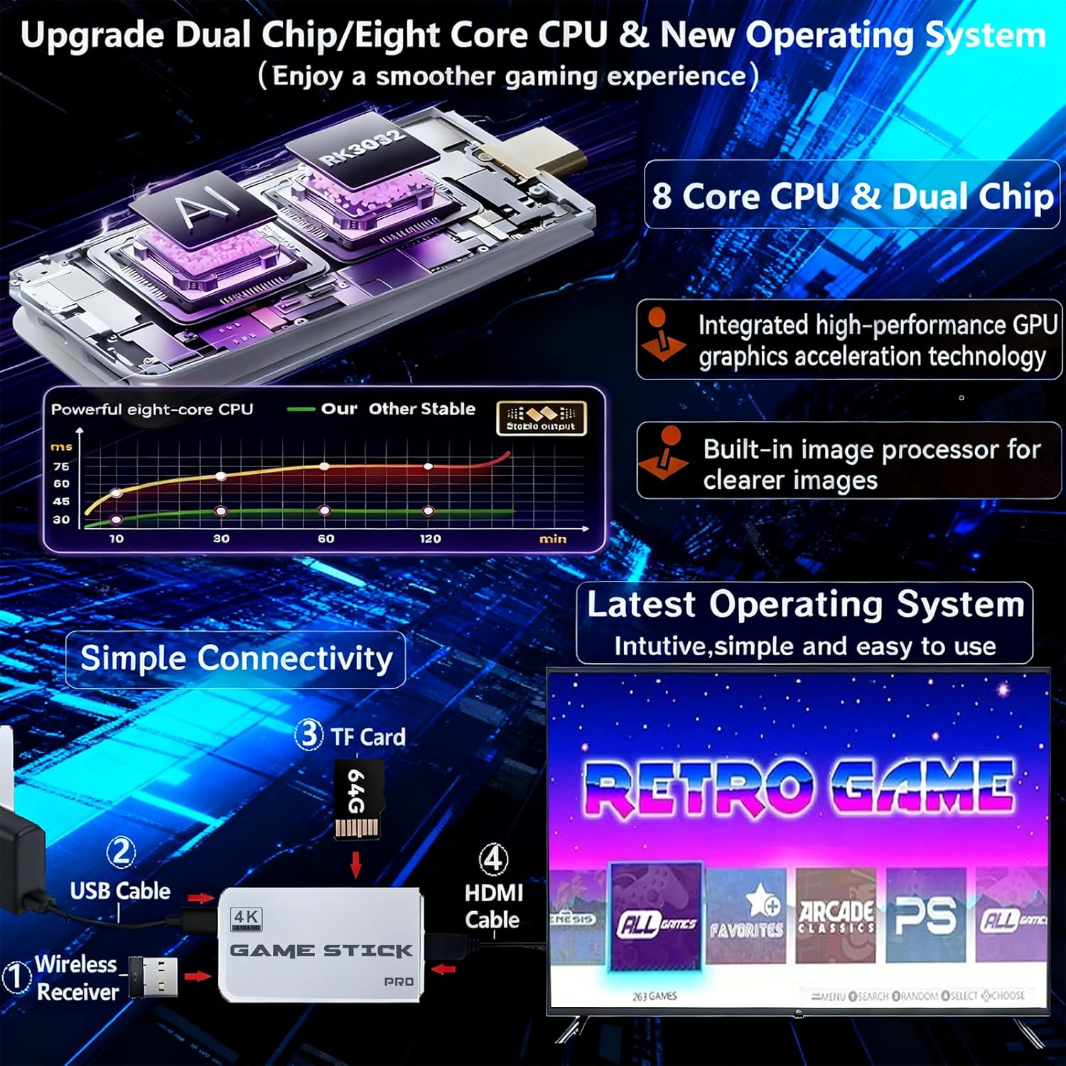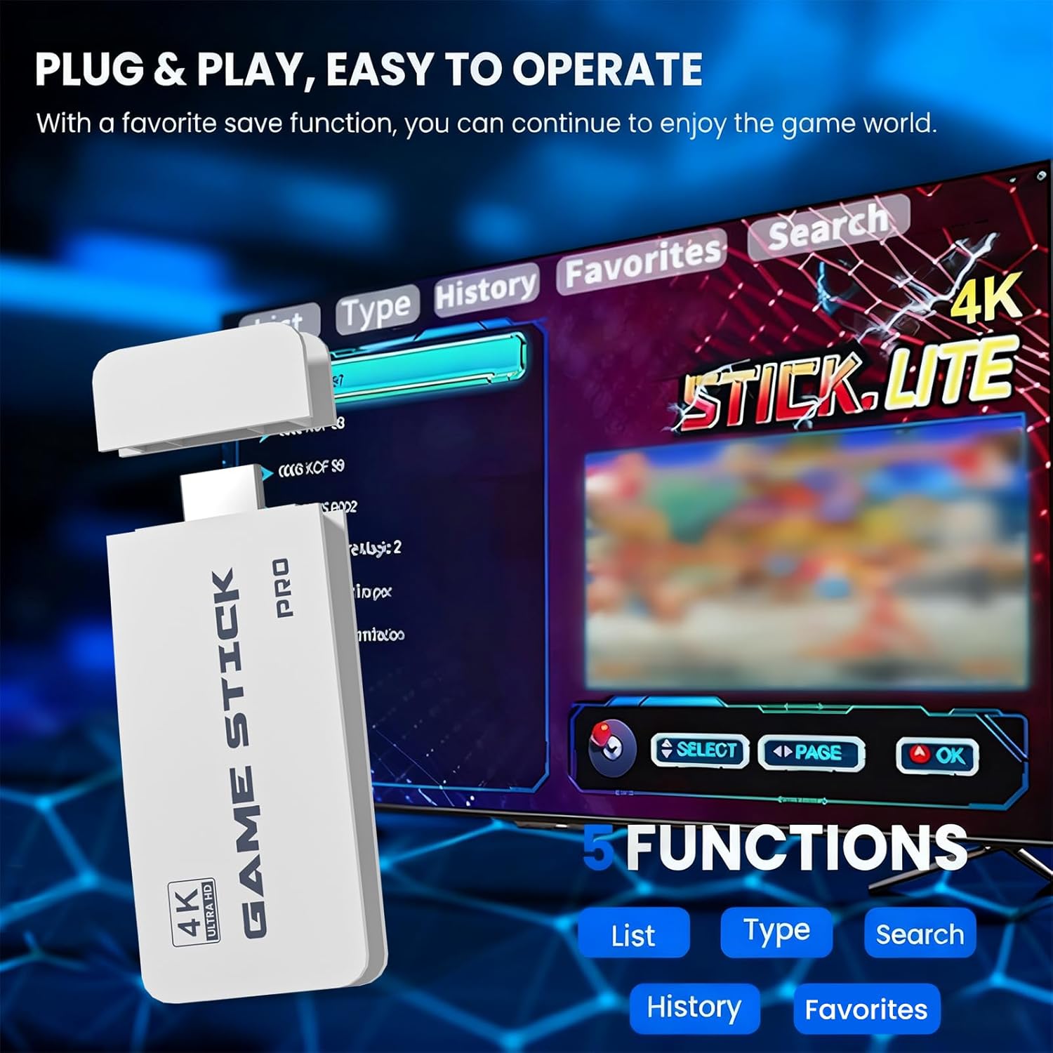 【Retro Game Stick Pro】Plug & Play Fun: Enjoy endless gaming with 20,000+ pre-installed games and 23 emulators on a 64GB system—no downloads or setup required. Relive retro gaming nostalgia instantly with a simple plug-and-play experience!