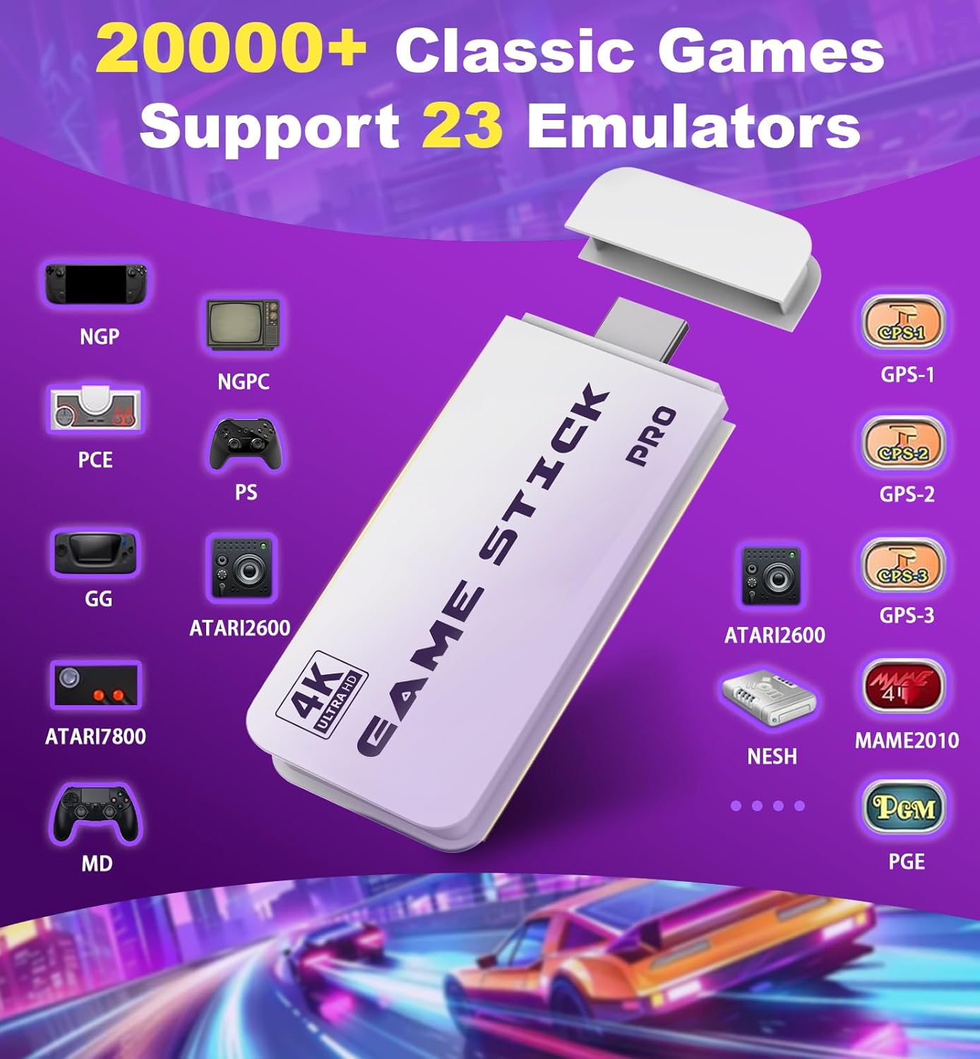 【Preloaded 20000+ Classic Games】This retro gaming console has over 20,000 built-in games and 23 emulators, and it includes a 64GB TF card. Simply connect the game stick 4k to your TV, PC, or projector to enjoy a vast selection of games, with no downloads, installations, or internet required.