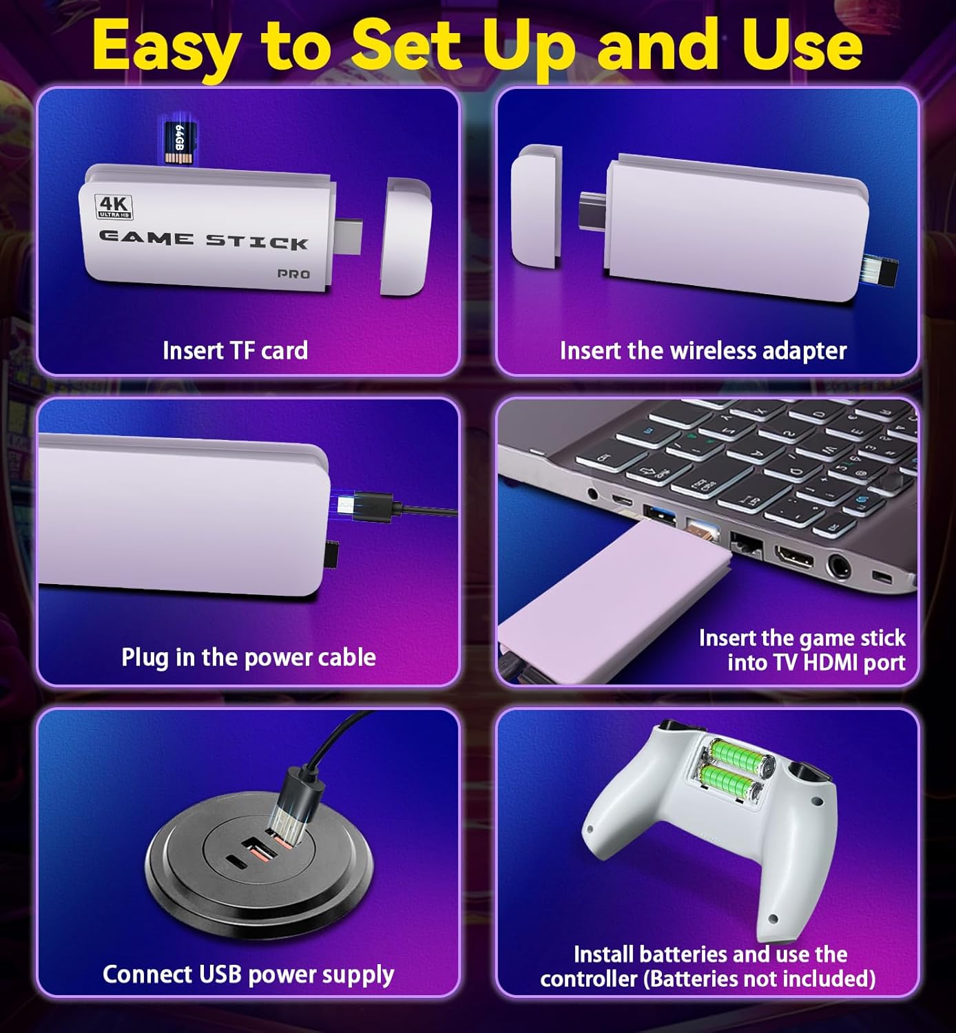 【Plug and Play Game Console】Simply connect the wireless receiver to the gamestick, plug it into the TV’s HDMI port, and power it using the USB cable. Once the blue indicator light is on, the game menu will appear automatically. Turn on the controller to start playing.