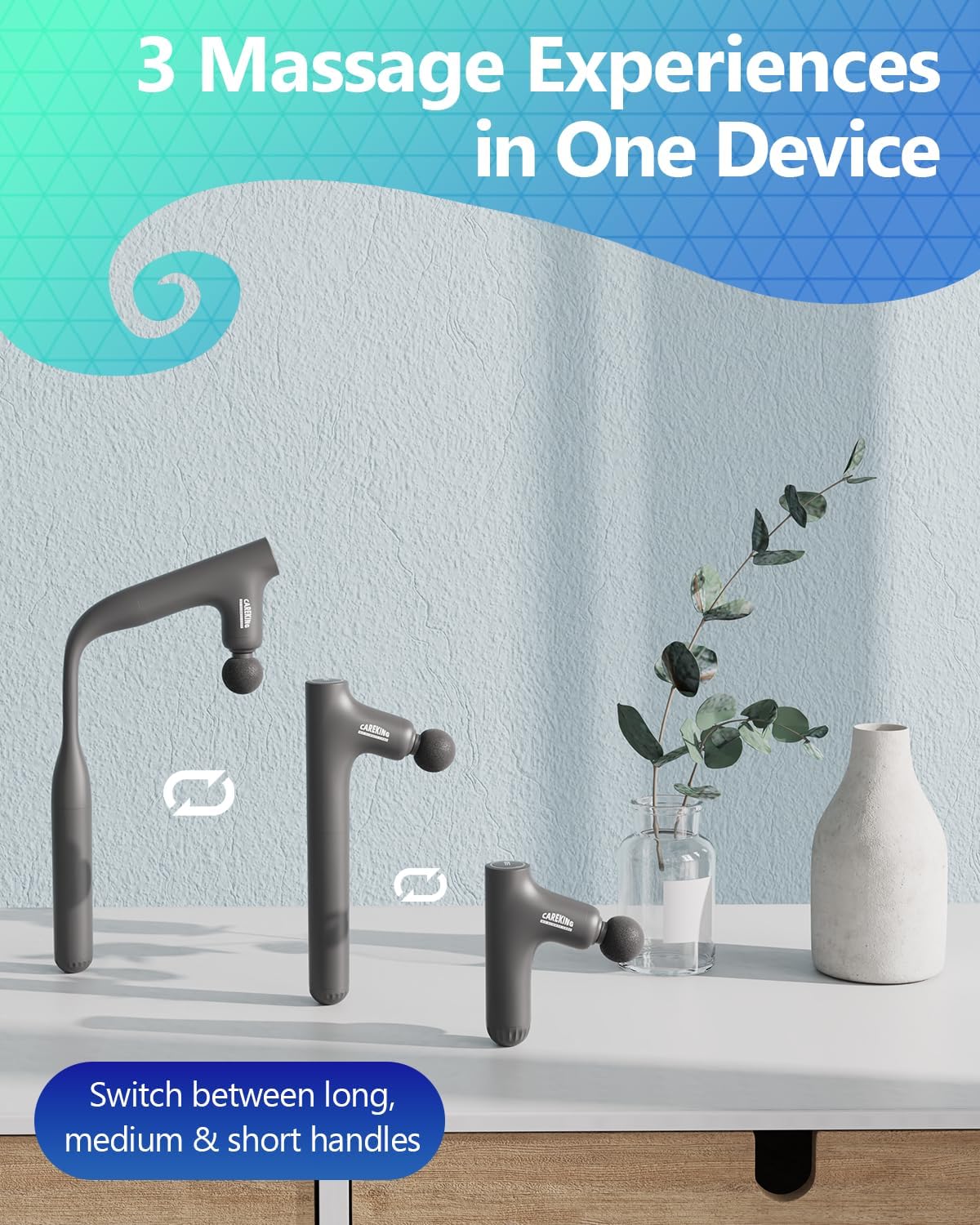 ✅ 3-in-1 Detachable & Ergonomic Extension Handle: This deep tissue massage gun comes with a 3-in-1 ergonomic extendable handle that easily converts into long, medium, or short handles. The long handle makes it effortless to use as a back massager for hard-to-reach areas, the medium handle targets thighs and shoulders, the short handle turns into a compact portable massage gun for precise relaxation anywhere