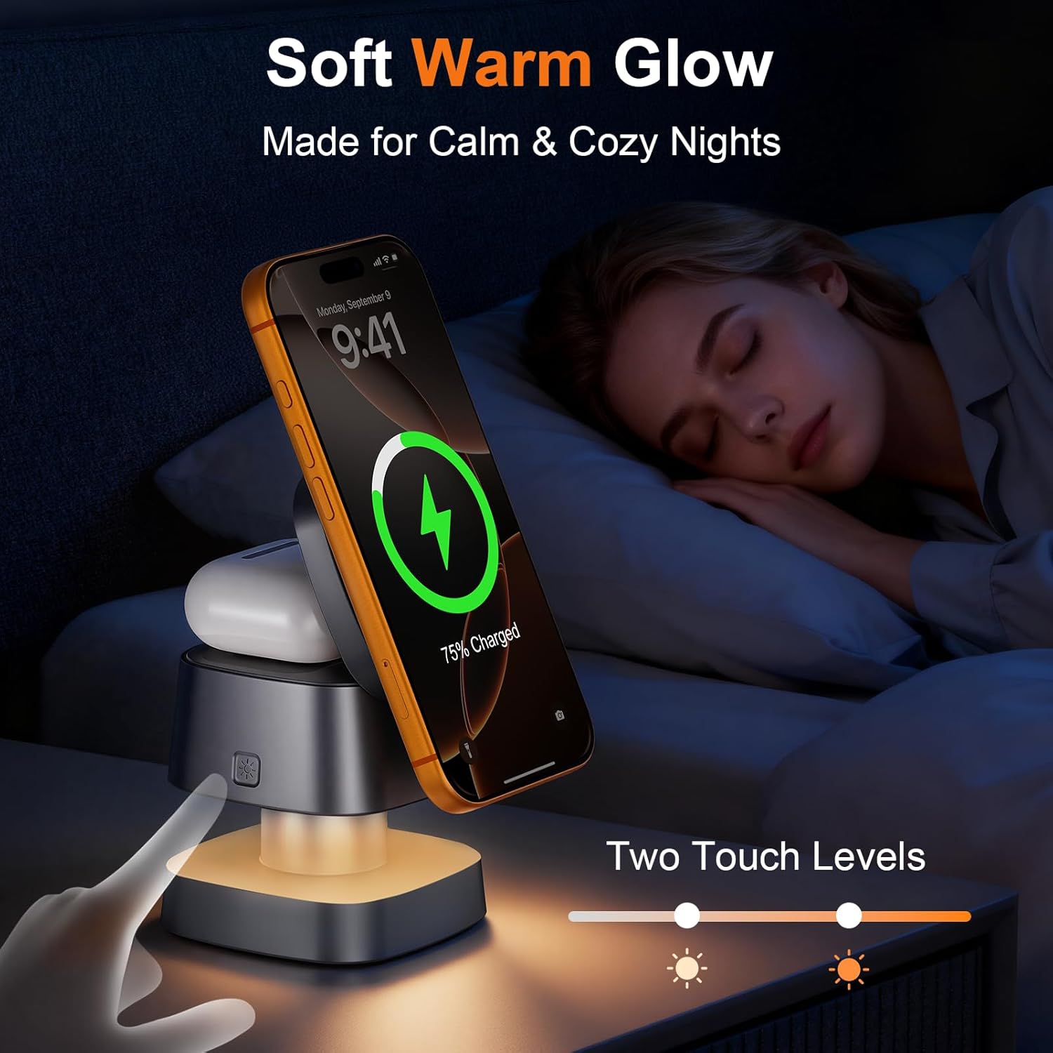 I love this charger! I put it on the end table in our family room, and it has become the universal charging station for everyone in the house. It’s so convenient having one spot where we can charge an iPhone, Apple Watch, and AirPods all at the same time — no more hunting around for cables or fighting over outlets.The charging speed is impressive. With a proper 30W adapter, it charges my phone noticeably faster than the older wireless chargers we’ve had. The built-in safety chip is also reassuring — no overheating or weird charging issues, even when all three devices are on it at once.The adjustable stand is a great feature too. You can tilt it to the perfect viewing angle, whether you’re watching a video, Face Timing, or just keeping the screen visible while it charges. And the little night light is such a nice touch — soft lighting with two brightness levels, perfect for evenings when you don’t want a harsh lamp on.I also love how portable it is. It folds flat, so it’s easy to take on trips, and the silicone base keeps it steady on the table. The whole setup looks sleek and clean — no cable clutter at all.Honestly, I have zero complaints. It works exactly as described, charges fast, and the whole family keeps using it. If you’re looking for a reliable, space-saving wireless charging solution, this one is perfect!! The value is pretty good for $55.99, I’m thinking about buying another for upstairs. 🙌⚡📱⌚🎧