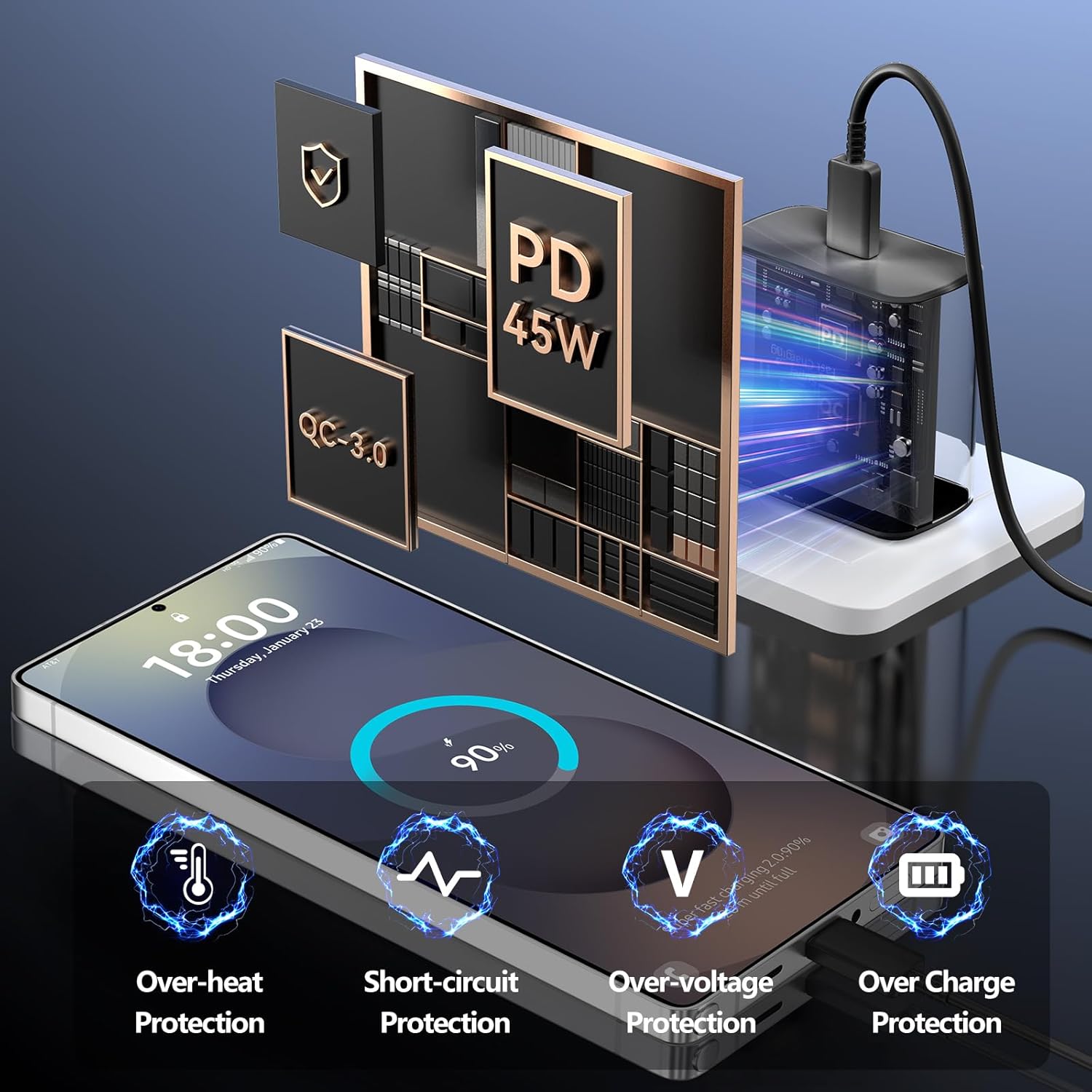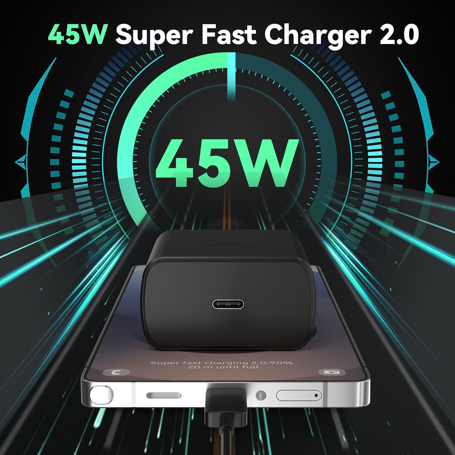 【45W Samsung Super Fast Charger 2.0】45 watt USB C super fast charger type c charger with maximum power of 45W Super Fast Charge 2.0 capability uses Power Delivery technology to provide the most efficient charge possible. Super fast charge for Samsung Galaxy S25/S24 Ultra from 0% to 50% in just 20 min, more faster than other 25W/15W chargers.