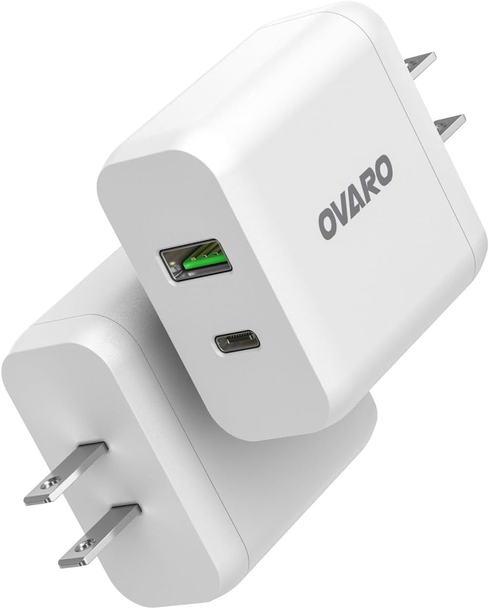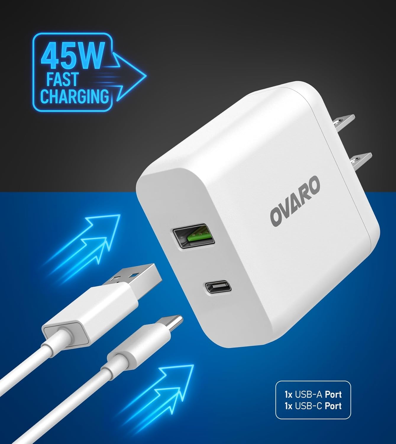 Ovaro 45W USB-C Fast Charger (with 3m USB-C to USB-C Cable) — Dual USB-C/USB-A PD Wall Adapter: Power up faster and farther. Our compact PD wall charger delivers up to 45W from the USB-C port when used alone for rapid charging on modern USB-C phones and tablets, plus an 18W USB-A port for legacy cables. When both ports run together, total output is 30W combined—perfect for topping off two devices at once. Built-in overcharge, overcurrent, and over-temperature protection helps keep your devices safe while you fast-charge. Includes a 3-meter (10 ft) USB-C to USB-C cable for couch, desk, or bedside reach. Why it’s great: Market-leading 45W USB-C: Solo USB-C port outputs up to 45W for rapid top-ups on compatible phones/tablets/laptops. Two-device convenience: USB-C + USB-A ports let you charge new and older devices together (30W total shared). Long 3m Type-C cable included: Extra-long reach for travel, office, or living room setups. Smart safety suite: Overcharge protection, temperature control, and auto-device detection help protect batteries. Travel-ready: Wide-voltage input (100–240V). Compact body fits bags and wall outlets easily. Made for today’s USB-C phones & tablets Apple iPhone (USB-C): iPhone 15/15 Plus and iPhone 15 Pro/Pro Max include and charge over USB-C; Apple documents USB-C on iPhone 16/16 Pro as well. Works great for iPhone 17/17 Pro Max which continue the USB-C standard. Apple iPad (USB-C): iPad Pro (M4 and earlier USB-C models), iPad Air (M2/M3 and 4th gen+), iPad mini (6th gen), and iPad (10th/11th gen) use USB-C ports. Samsung Galaxy: Galaxy S24/S24+/Ultra ship with USB-C to USB-C cables and charge via USB-C; also compatible with many Galaxy A/FE and Tab models using USB-C. Google Pixel: All Pixel phones charge with USB-C, including Pixel 6/7/8/8a/9/9 Pro/9 Pro XL and newer; Google’s own 45W charger references USB-C fast charging on Pixel 9 series. Also works with most USB-C Androids (e.g., OnePlus, Moto, Nothing) that accept USB Power Delivery over Type-C. (See your device’s PD/PPS support for peak wattage.) Notes on performance For the fastest charge, use the USB-C port alone (up to 45W) with the included C-to-C cable and a device that supports USB-C PD fast charging. Using both ports together shares power (30W total). Actual speeds vary by device, battery level, and cable. Safe for overnight charging thanks to overcharge protection. In the box Ovaro Dual-Port 45W PD Wall Charger (USB-C + USB-A) 3m (10 ft) USB-C to USB-C cable Quick start guide