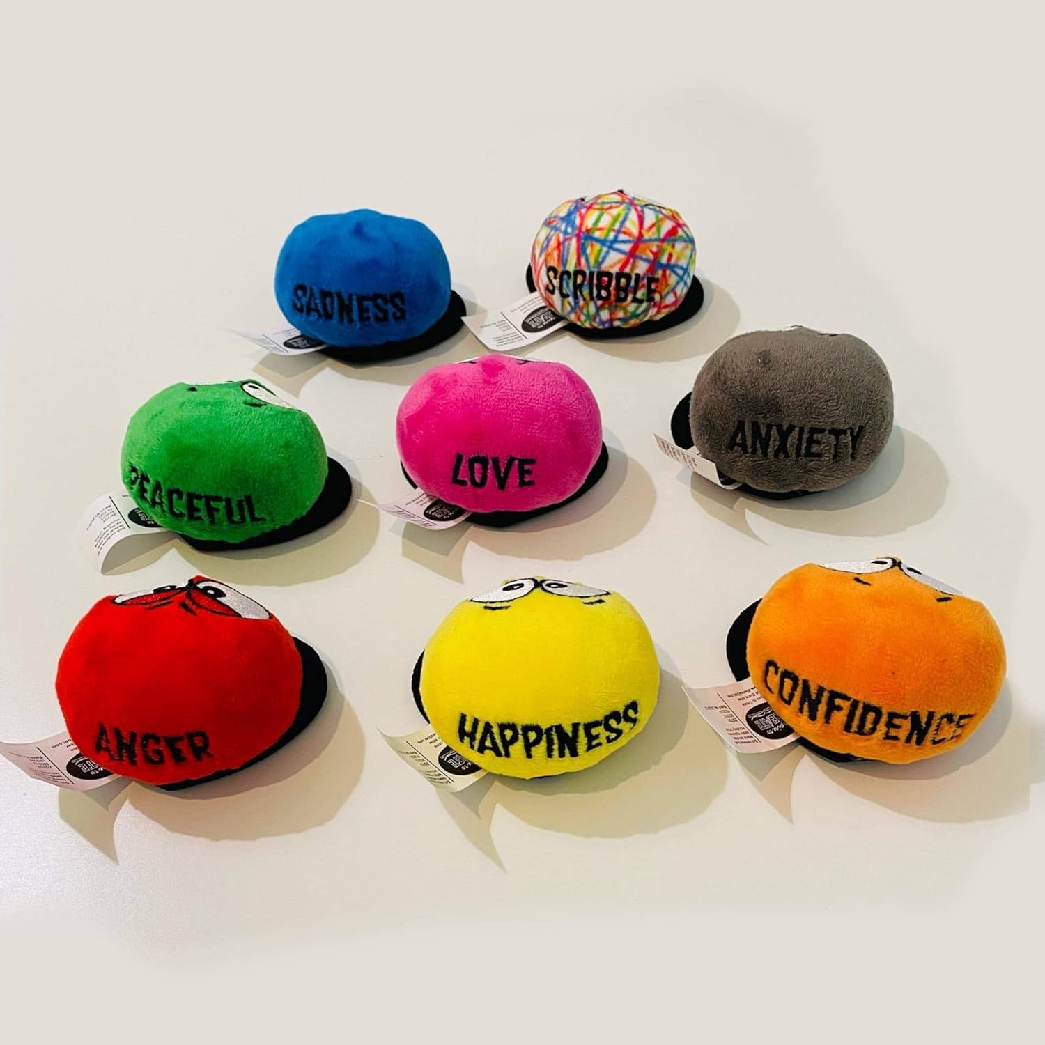 The PLUSH TOY EMOTIONS included are: Anger, Anxiety, Peaceful, Sadness, Happiness, Love, Confidence and Scribble (Tangled).
