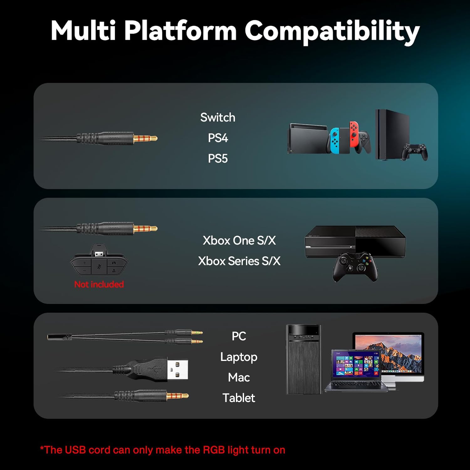 PC, Ps4, Ps5, Xbox One (adapter not included), Xbox One SNintendo Switch, smartphones, laptops and tablets.