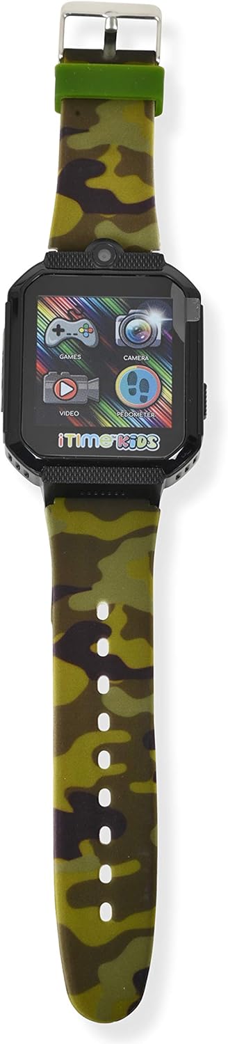 iTIME Kids Smart Watch boasts a military camouflage strap, interactive icons & 26 games, merging outdoor adventure with high-tech educational fun.