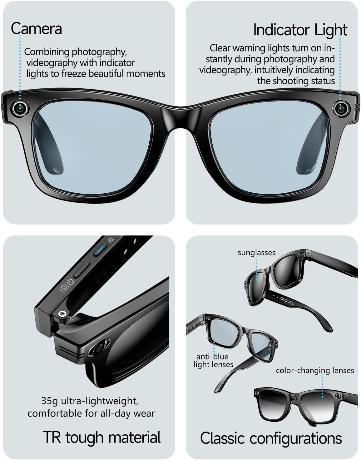 Eye Protection recording glasses and Comfort: Ai Glasses with Camera Polarized lenses with UV protection offer clear vision and safeguard your eyes from harmful light, while the lightweight 35g design ensures comfort throughout the day