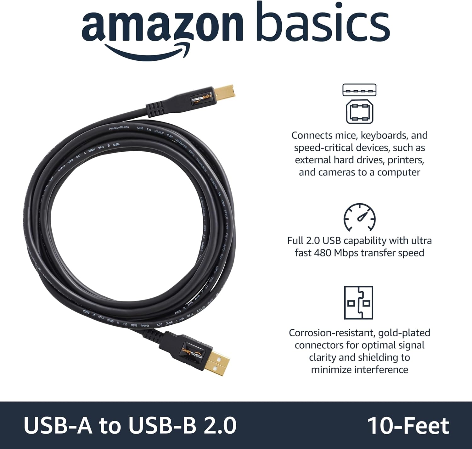 Amazon Basics USB 2.0 Printer Cable – A-Male to B-Male Cord – 10 Feet (3 Meters), Black