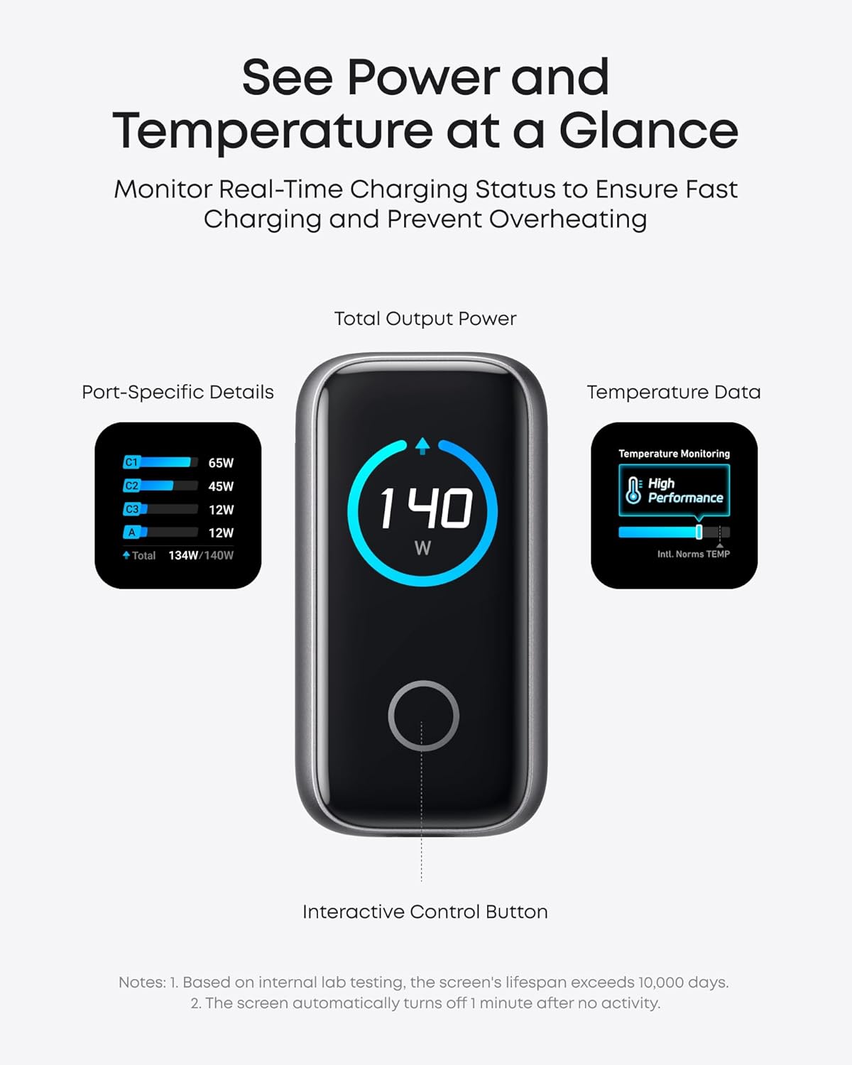 Monitor with Ease and Clarity: The high-definition color display provides a detailed view of the charging status, temperature, and port details, keeping you fully informed.