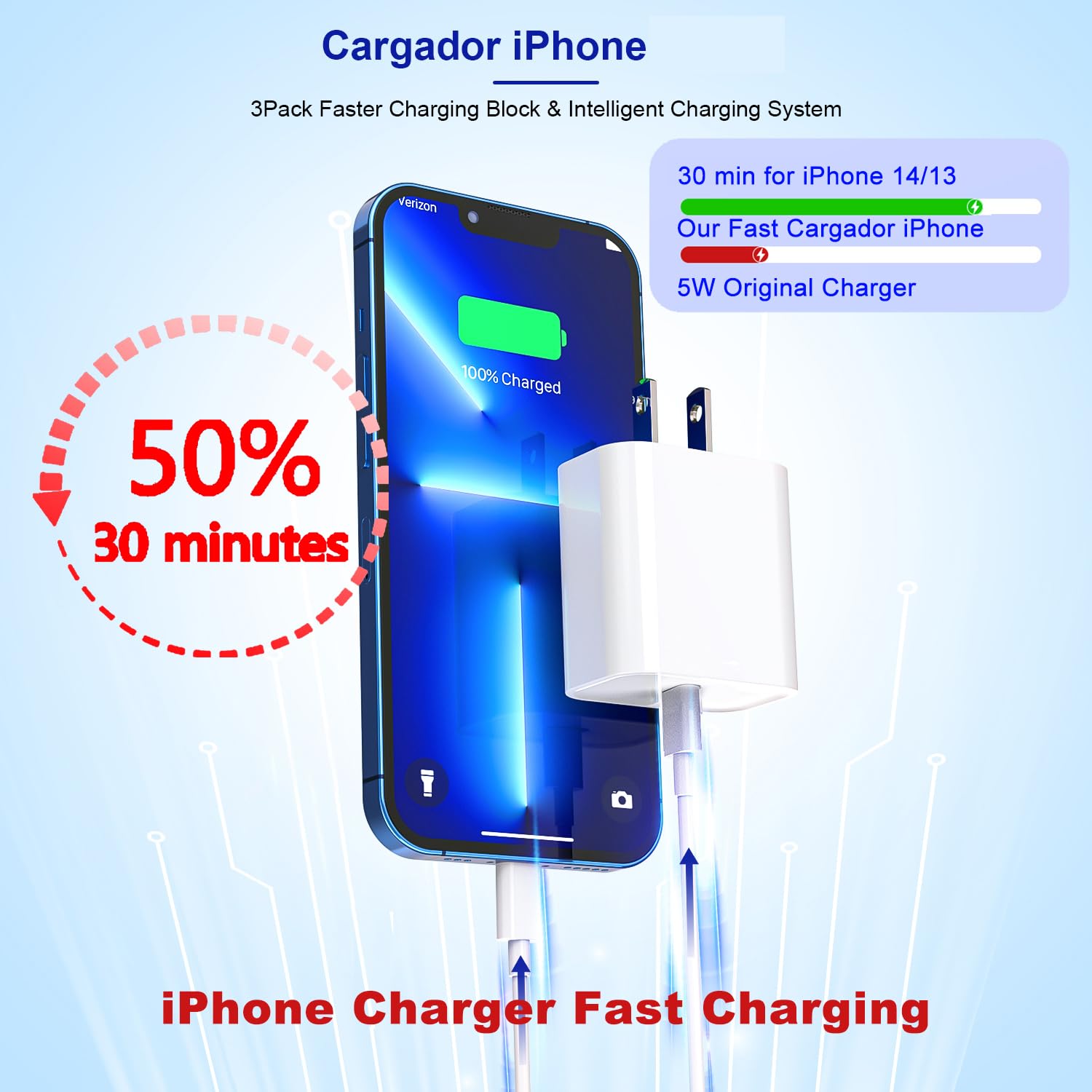 â—† Apple MFi Certification â—† Our 3-Pack cargador iphone apple charger is expressly authorized by Apple MFI certificated.The lightning cable built-in smart identification chip which automatically protect your device from damage.The Super fast charger iphone is 50% faster than 5W original charger which saving more time of your life.The Official guarantees for durability and reduce the problems of overheating,poor contact when your iPhone/iPad/iPod/Airpods is charging.