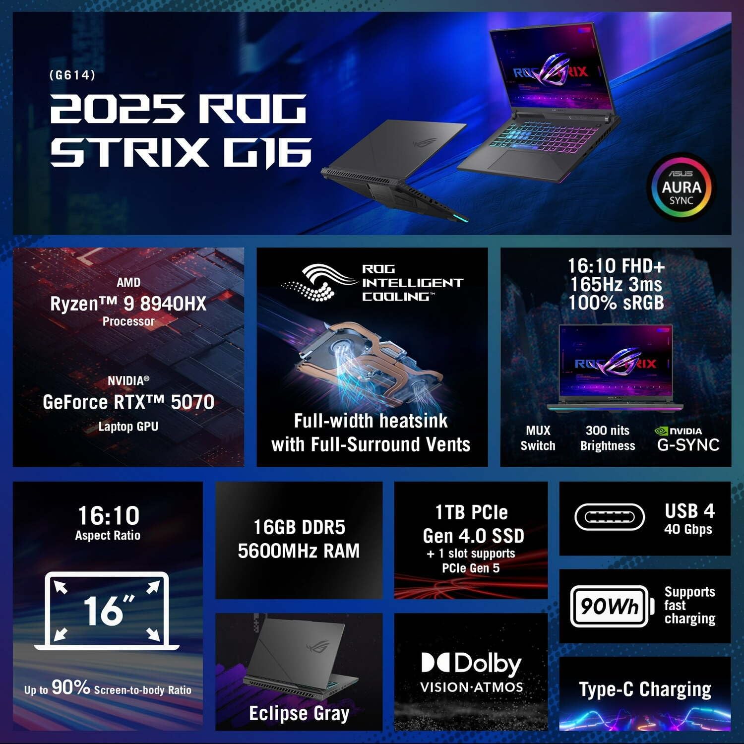 1 review for ASUS ROG Strix G16 Gaming Laptop, 16” FHD+ 165Hz/3ms, AMD Ryzen 9 8940HX, GeForce RTX 5070 8GB GDDR7, 32GB DDR5-5600, 1TB PCIe Gen 4 SSD, Wi-Fi 6E, Win11 Pro,RGB Backlit KB,w/Lifetime Office