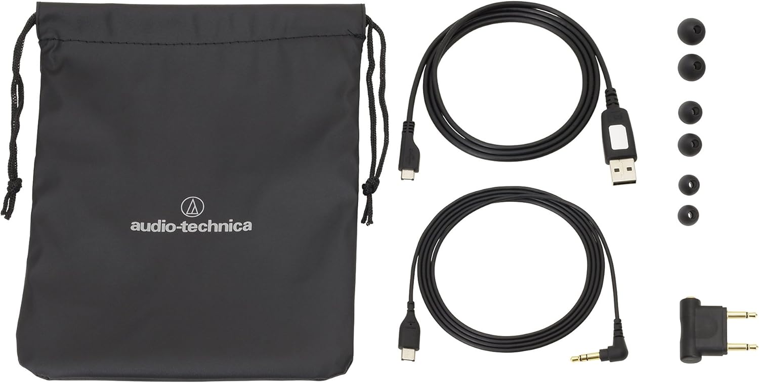 Includes: Fine-fit earpieces (XS, S, M, L), carrying pouch, USB cable for charge (1.0m), connection cable (1.2m), airplane adapter