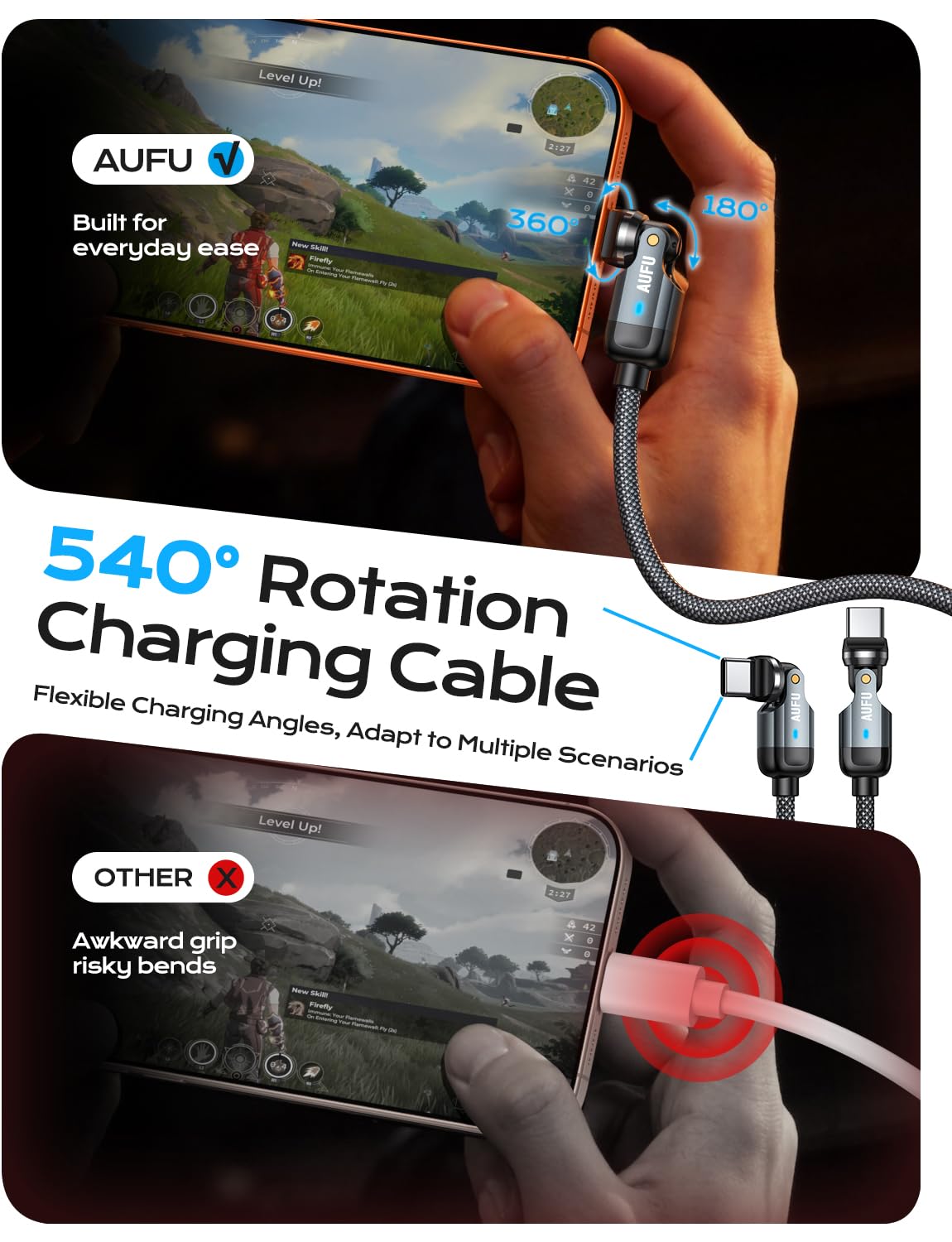 𝐀𝐔𝐅𝐔 𝐔𝐧𝐢𝐪𝐮𝐞 𝐃𝐞𝐬𝐢𝐠𝐧: Drawing inspiration from futuristic mechanical aesthetics, this 90 degree USB C cable features dual-head 360° and 180° rotating connectors, blending practicality with visual impact. Crafted for gamers and tech enthusiasts, it seamlessly merges distinctive design with everyday comfort. Backed by AUFU’s professional R&D team, each product undergoes continuous iteration and upgrades to meet ever-growing charging demands.