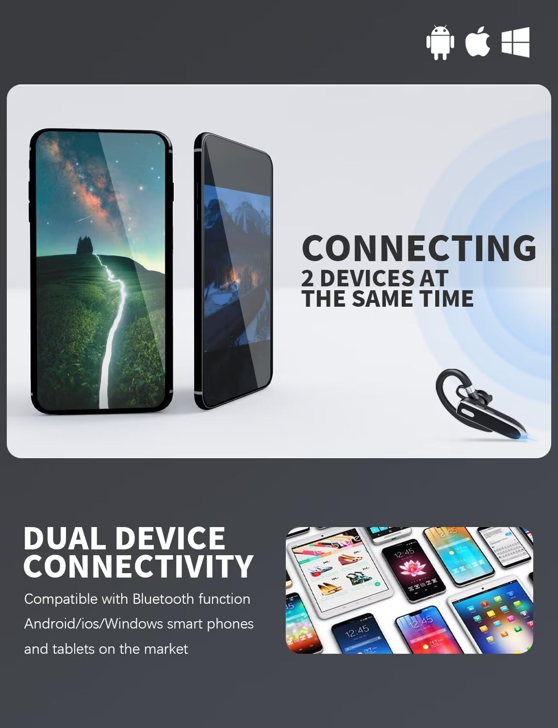 Connect Two Devices & Two Charging Methods: It can also be connected with 2 devices simultaneously, It It’s a good ideal for separating your life and work. You can charge your bluetooth phone headset with TYPE-C charging cable or charging case. It is suitable for office environments and driving.