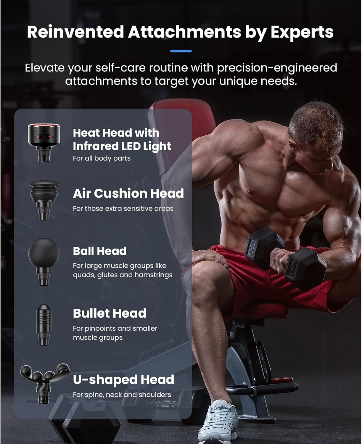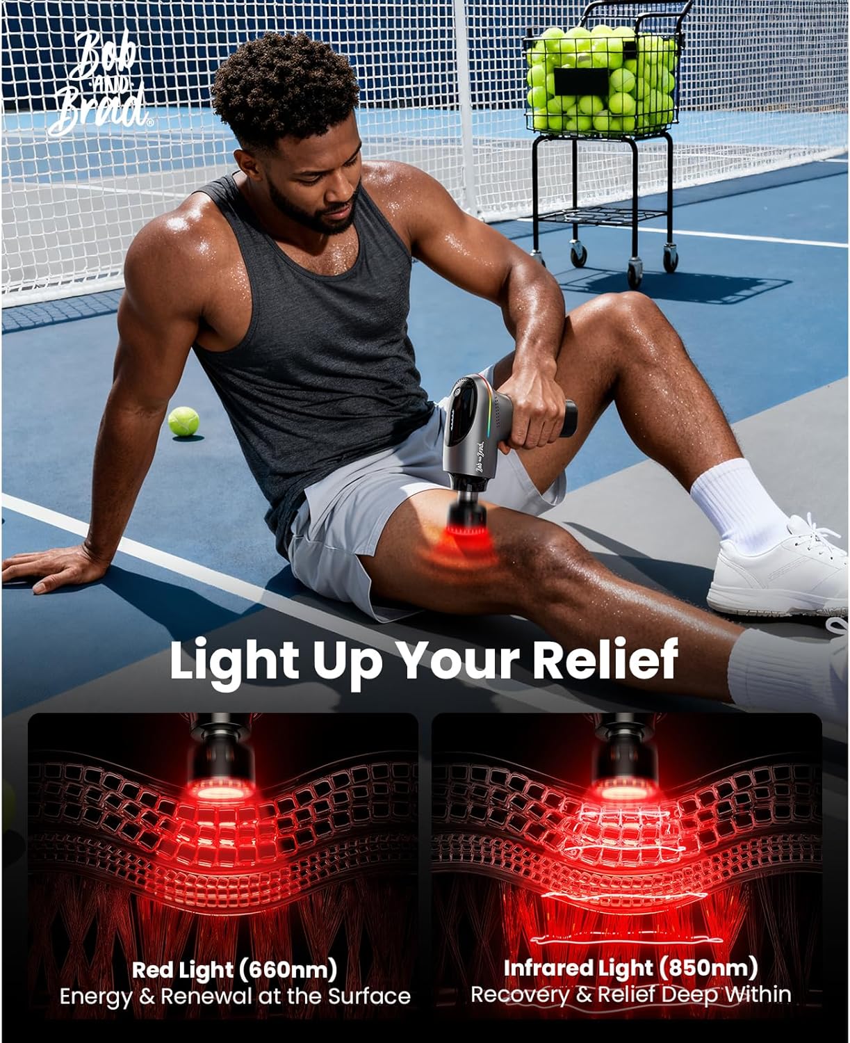 Unlock Profound 4-in-1 Relief with Red Light, Heat & Deep Percussion: This percussion massage gun fuses four powerful therapies: therapeutic 660nm Red Light & 880nm Near-Infrared, muscle-relaxing thermal heat (104°F to 113°F), and intense deep tissue percussion (10.5mm amplitude). This synergistic, multi-targeted approach penetrates far beneath the surface, effectively addressing the root cause of chronic stiffness and post-workout soreness for superior recovery compared to standard devices.