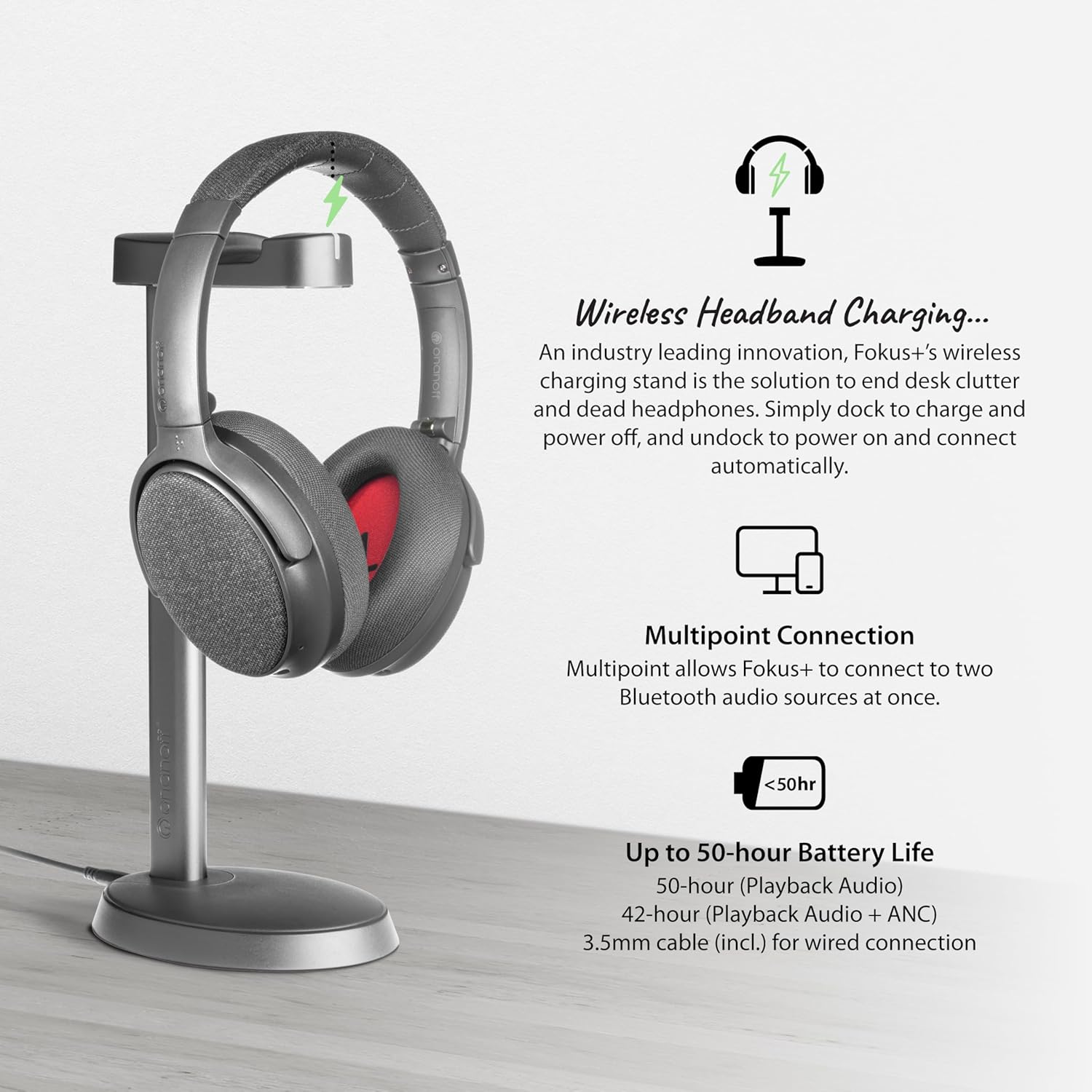 WIRELESS CHARGING STAND: The FOKUS+ boast the convenience with its wireless charging stand, enabling a seamless and user-friendly experience. Simply place the headphones on the stand and it will automatically switch off and start charging.