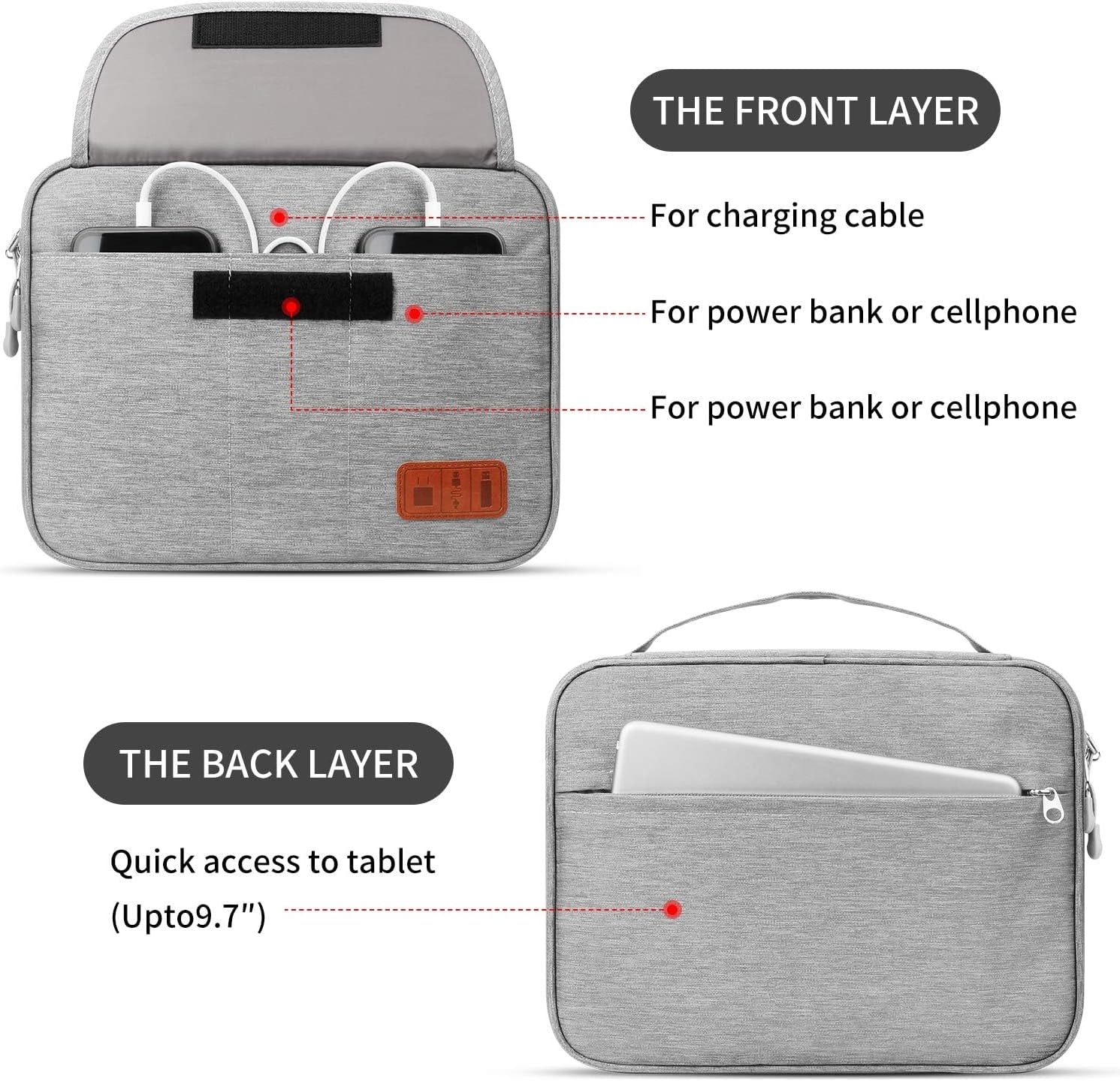 * 3 special SD card pouch to prevent your small SD card missing* 3 inner mesh pockets can fit power bank or phone or small hard drive* 15 elasticized mesh segments and 2 elastic loops for cables* 1 big side pocket for cell phones, wallets and other daily things* 1 added hand strap for easy carrying when you go out* 2 iPad pockets can hold ipads under 11 inches