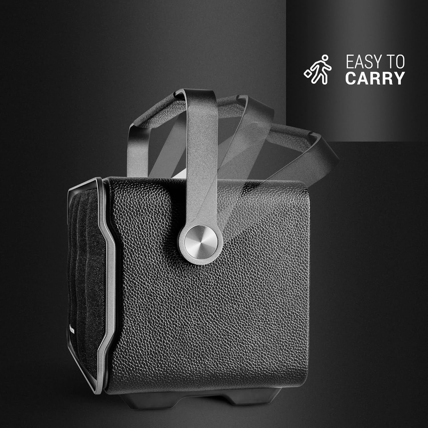 Retro design Bluetooth speaker with 150W power, sound equalizer and up to 10 hours runtime. Get the most out of your music with the extra bass button and take it with you wherever you go thanks to the folding handle.