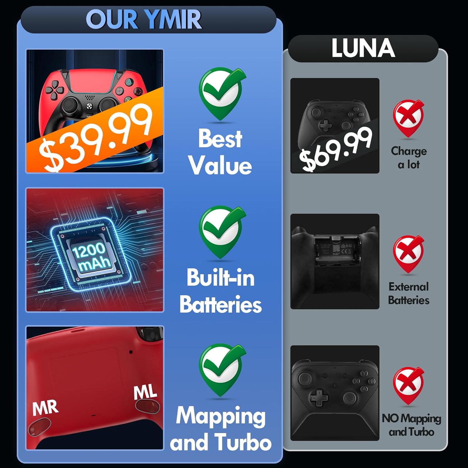 🎮【𝐀𝐟𝐟𝐨𝐫𝐝𝐚𝐛𝐥𝐞 𝐀𝐥𝐭𝐞𝐫𝐧𝐚𝐭𝐢𝐯𝐞 𝐭𝐨 𝐭𝐡𝐞 𝐋𝐮𝐧𝐚 𝐂𝐨𝐧𝐭𝐫𝐨𝐥𝐥𝐞𝐫】Our Ymir PC Controller offers wide compatibility with Fire TV Stick, Apple TV, Samsung TV, PS4, PC (Tablet, iPad, Laptop, Mac, Chromebook), Android phones, iPhone, Tesla, and Steam Deck. Built-in 1200mAh rechargeable battery provides long gaming sessions, outperforming the Luna Controller that relies on disposable AA batteries.
