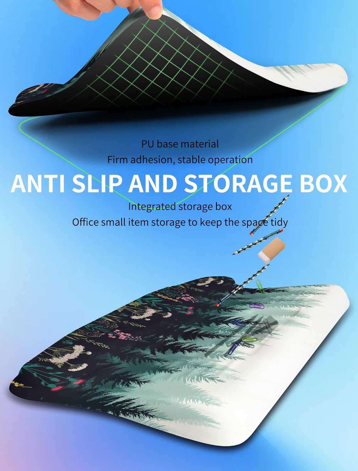 【Compact Design with Storage Box 】17.3×9.8×1.2inch (440x250x30mm), compact curved appearance, equipped with a storage box for commonly used office small items (pens/paper clips/staples, etc.), keeping your desktop tidy at all times