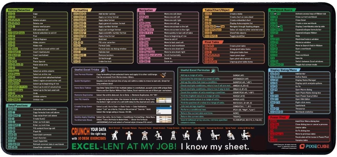 12 reviews for Excel Shortcut Keys Mouse Pad – Extended Large XXL Cheat Sheet Gaming Mousepad | PC Office Spreadsheet Keyboard Mat | Non-Slip Stitched Edge
