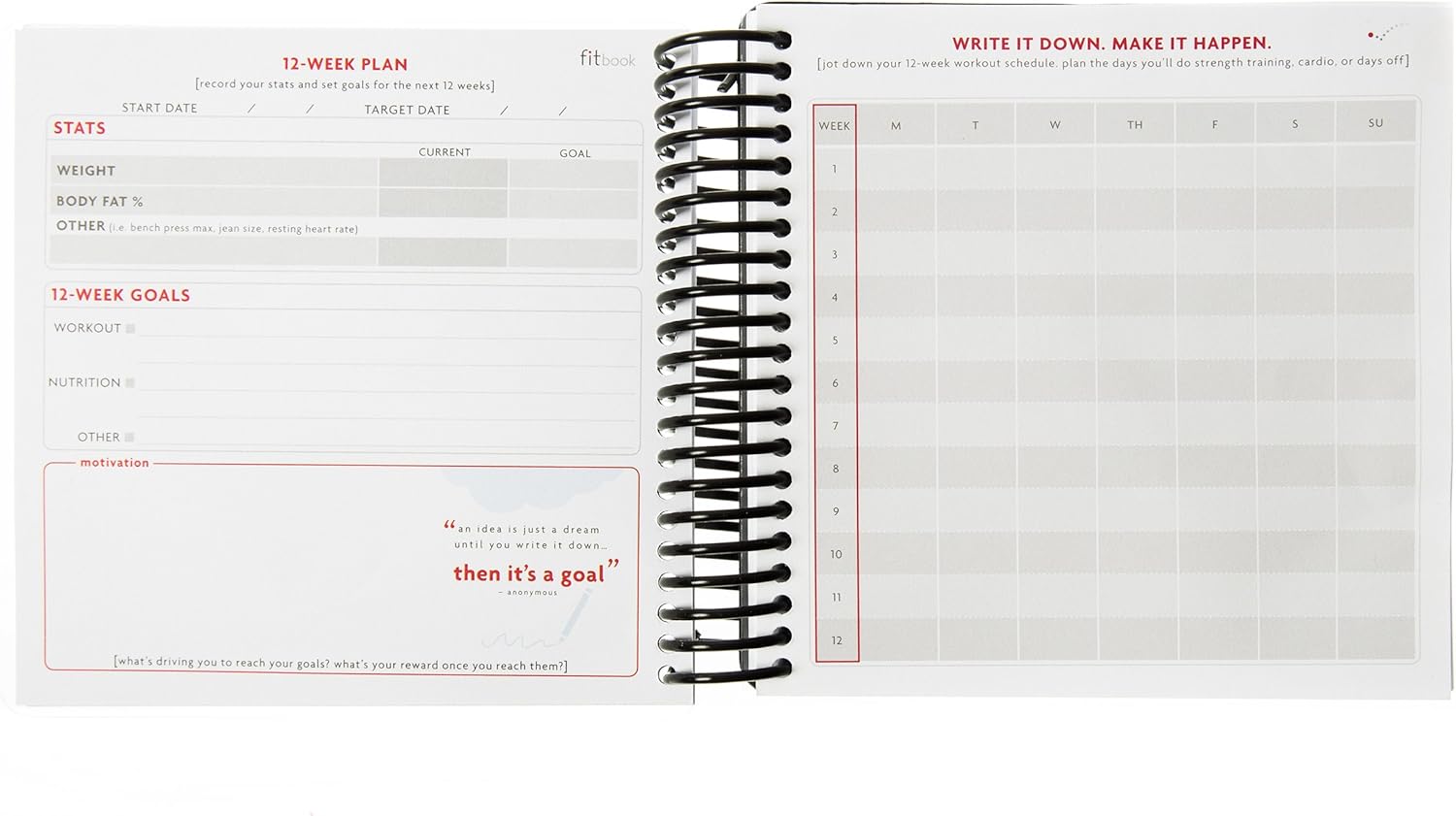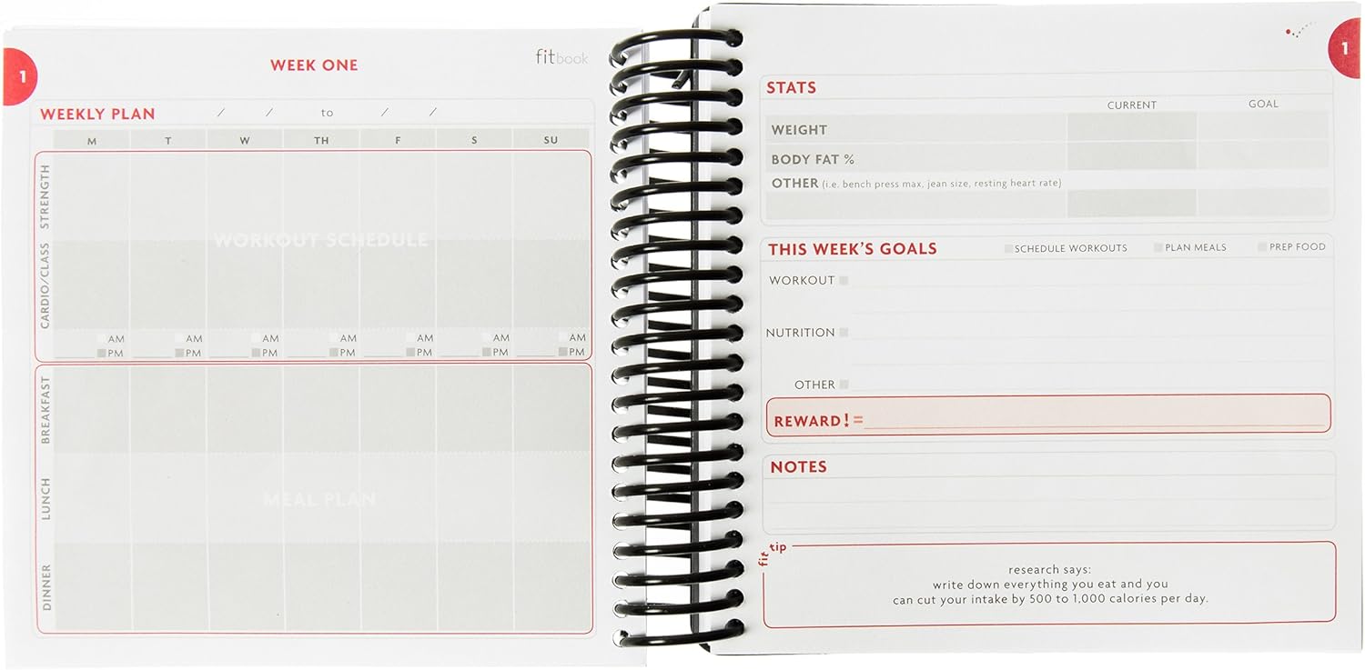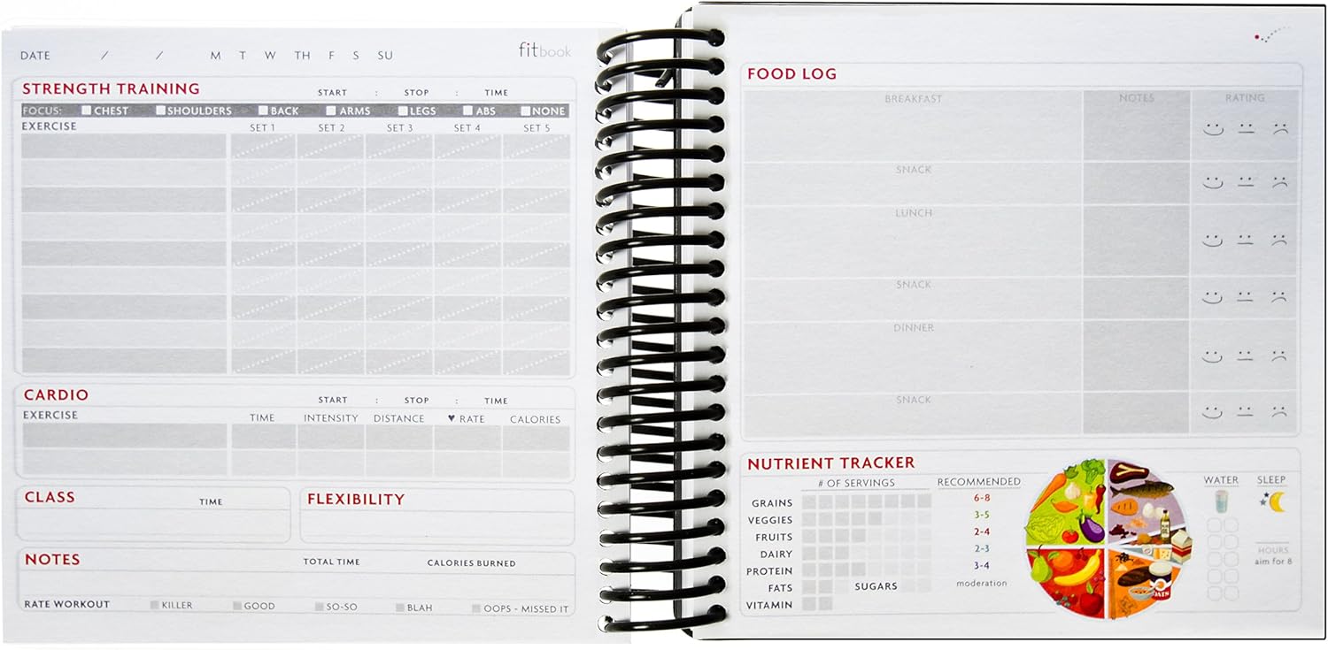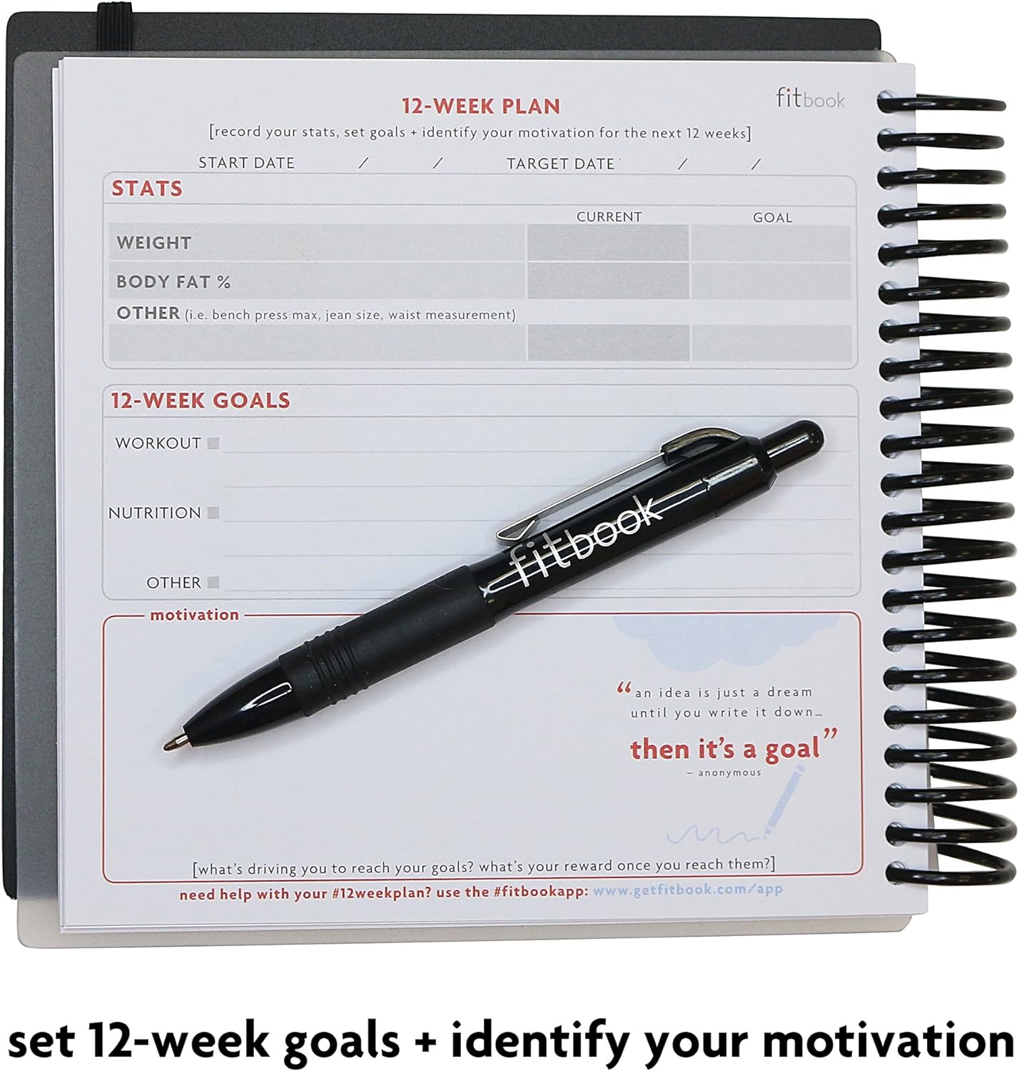 Includes a FREE download for the fit book+ goal setting app to help you set a realistic, healthy 12-week goal and provide you with a printer-friendly download of your goals..Includes daily and weekly planning pages, plus space to log before and after measurements.