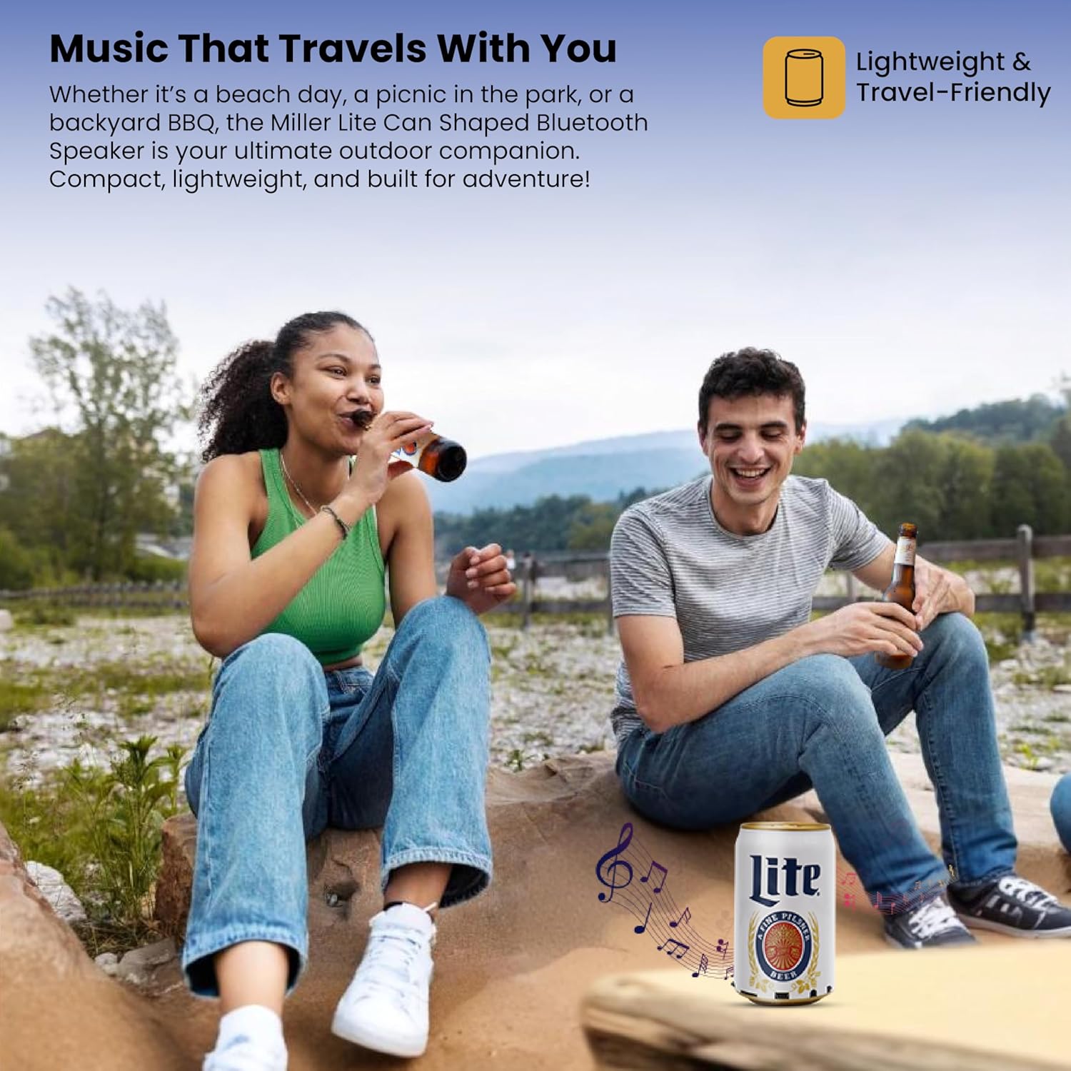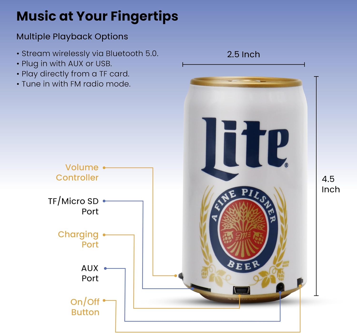 - This speaker features a dynamic acrylic case shaped like a classic Miller Lite can, blending nostalgia with modern style. Its eye-catching design is sure to be the center of attention at any group hangout or beach weekend party. Compact and easy to carry, it’s perfect for anyone looking for a fun, practical gift that stands out.