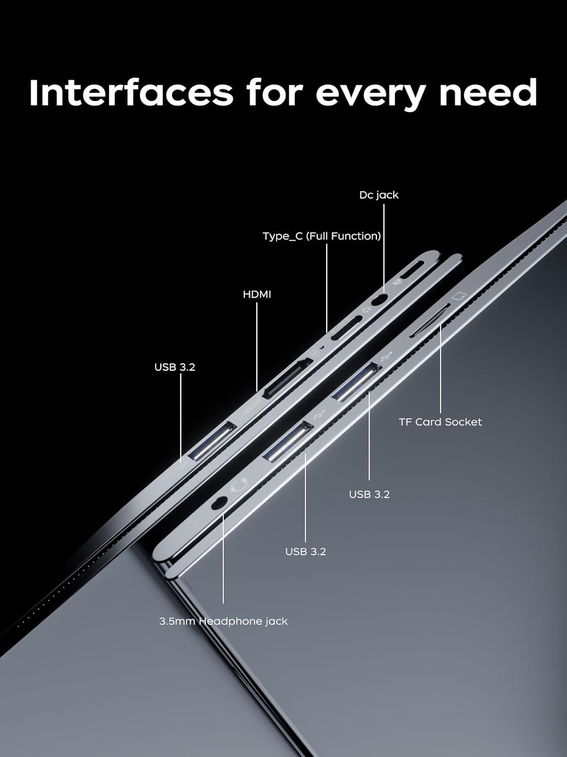 Offers a full suite of ports—including 3 USB 3.2 ports, 1 3.5mm headphone jack, 1 DC power port, 1 HDMI 1.4 port, 1 full-function Type-C port, and 1 TF card slot. In office settings, USB ports connect peripherals like printers and portable hard drives for rapid file transfers; the HDMI port links to projectors for seamless meeting presentations; the full-function Type-C port supports data transfer, charging, and external displays, delivering versatile connectivity solutions for professional environments!