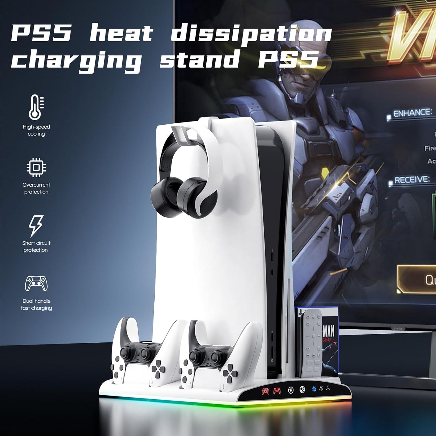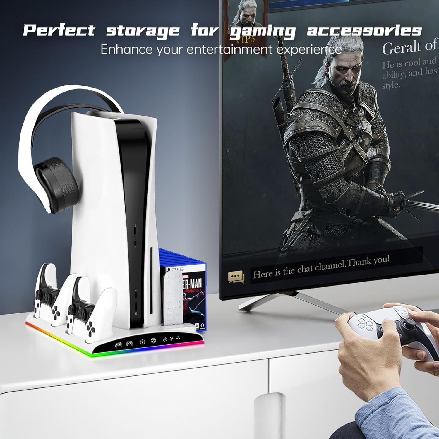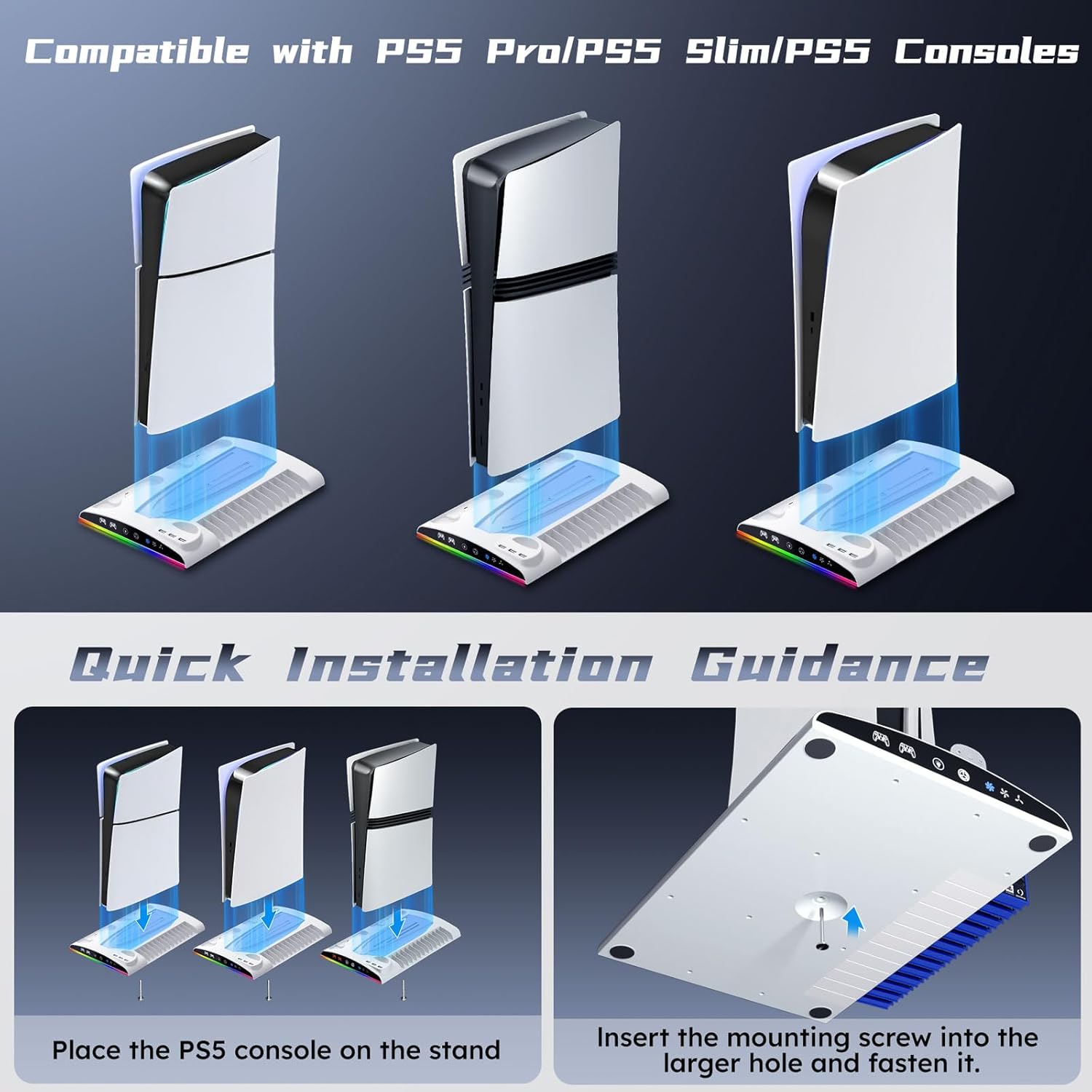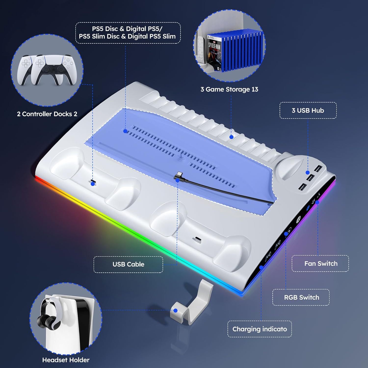 Garlo PS5 Stand with Cooling Station, Controller Charging Station for PlayStation 5 & Slim Console Disc/Digital Edition – Accessories: Cooling Fan, RGB LED, USB Hubs, Headset Holder, Game Slot