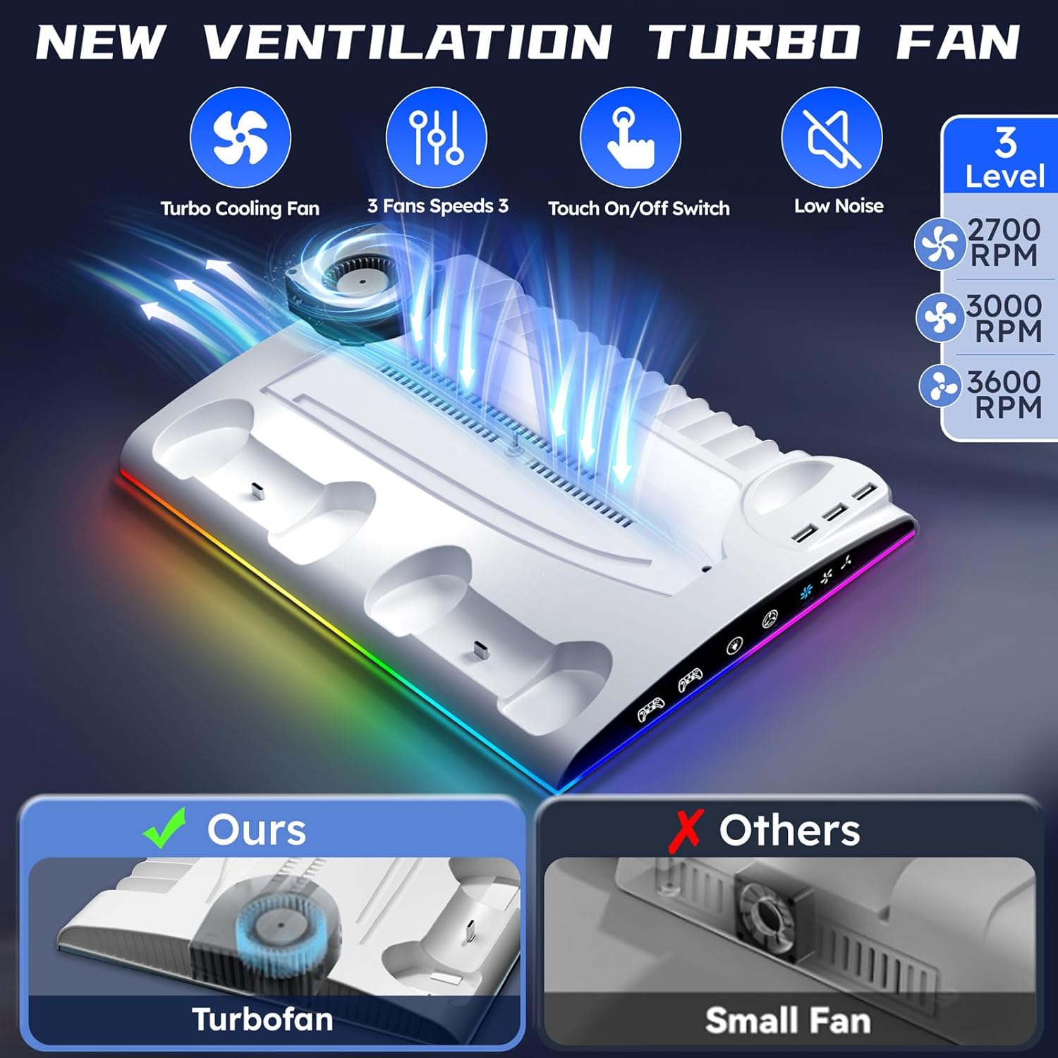 ❄️Enlarged Silent Turbo Cooling Fan: The PS5 cooling station has upgraded powerful turbo fans, and the fan can be adjusted in three gears (high, medium, and low). After 3,000 tests, the heat dissipation effect has been improved by 5 times, which greatly improves the heat dissipation efficiency, allowing your PS5 console to stay cool and play for a long time, greatly reducing the heat inside the console, and can be turned off when not in use.