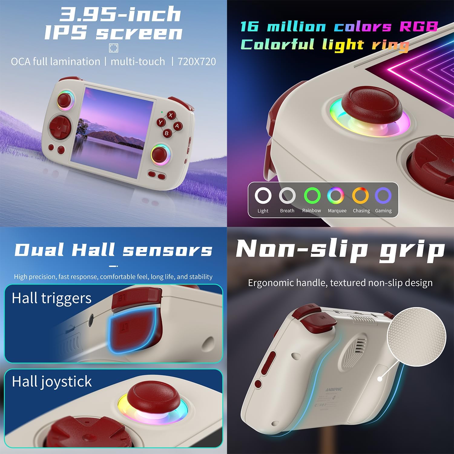 【Immersive experience】RG Cube game console is equipped with 16 million color RGB rocker lighting, this machine comes with constant bright breathing, rainbow, magic color, light tracking effect. Users can customize the colors and adjust the brightness. The RG Cube has a 3.95-inch IPS screen with a 720 by 720 resolution, allowing you to immerse yourself in the game. Delivers refined and comfortable visuals with refined visuals and responsive multi-touch. Perfect for indulging in retro gaming experiences.