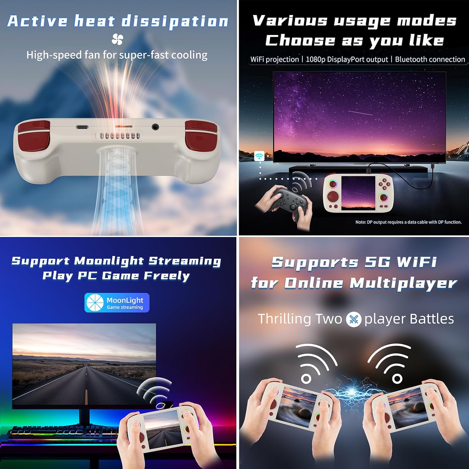【High performance】The RG Cube is equipped with Unisoc T820 processor, 6nm EUV 5G SOC chip, 8 cores, Includes Hall joystick, six-axis gyroscope, Hall trigger, high-speed fan, and heat pipe cooling for smooth performance. Supports 3.5mm stereo headphones, Power-saving settings, Joystick light control, Display brightness, and various function properties and free settings.