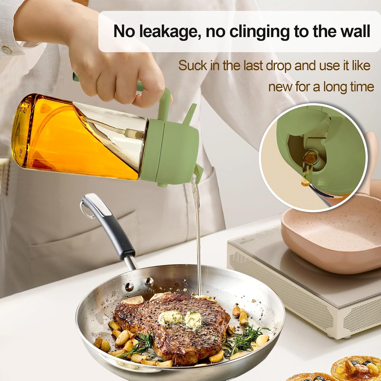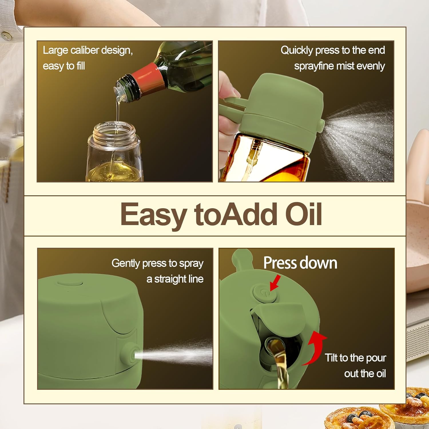 《2 in1Dual-Function Design》This New upgraded 2 in1 oil mister offers both spray and pour ,Simpliried usage options for total control while cooking, It’s a versatile oil dispenser bottle spray and pour as needed to keep your kitchen clean, organized, and efficient,suitable for a wide range of food preparation processes such as salad dressing, griddle, roasting, grilling.