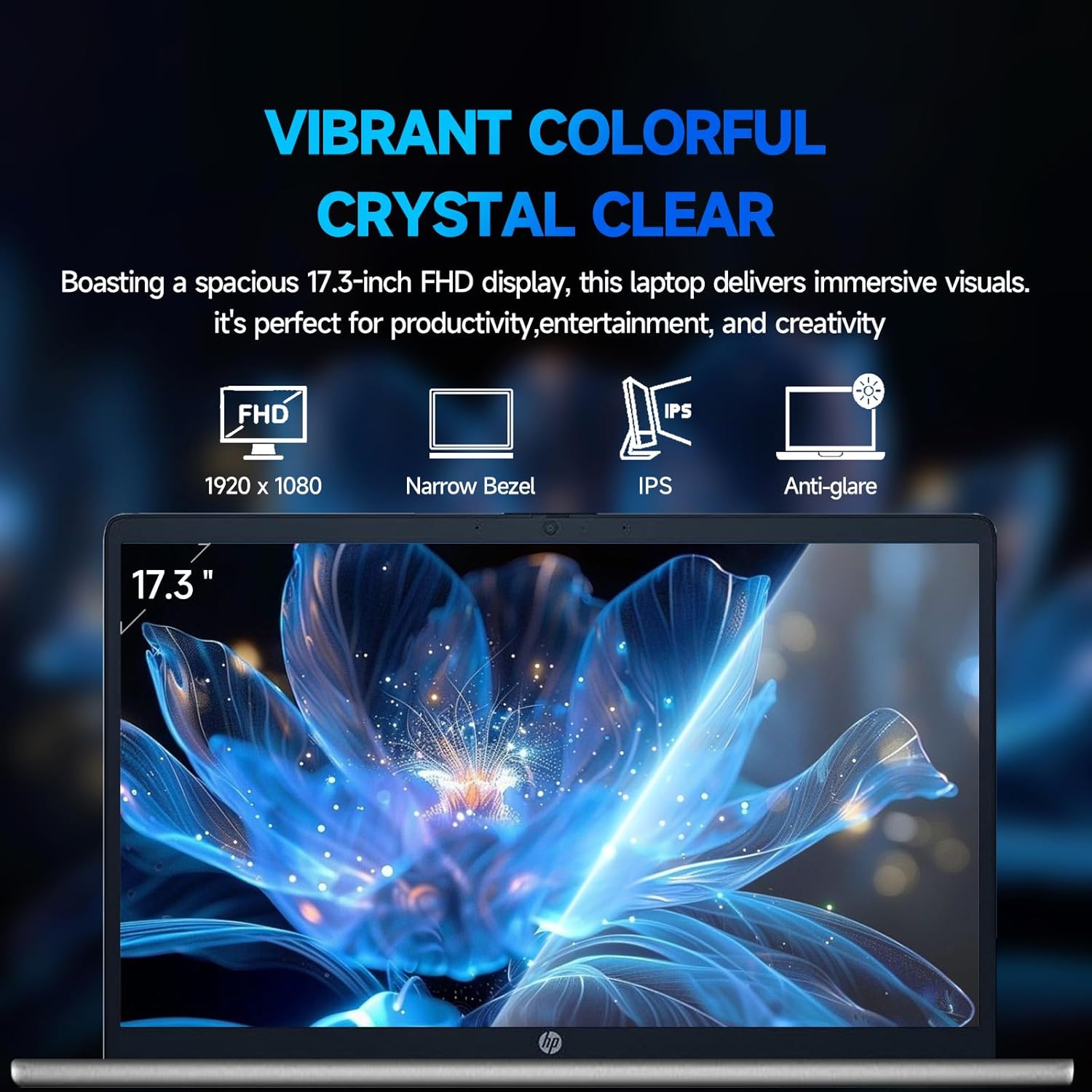 IMMERSIVE DISPLAY: Experience sharper visuals on the HP 17.3″ laptop with an FHD (1920 × 1080) IPS anti-glare display that reduces reflections and is easy on your eyes. The HP laptop 17 inch screen allows you to run multiple apps side by side, switch between tasks faster, and enjoy a more immersive viewing experience. Whether for work or study, the large screen on the HP 17 inch laptop computer boosts productivity and comfort all day