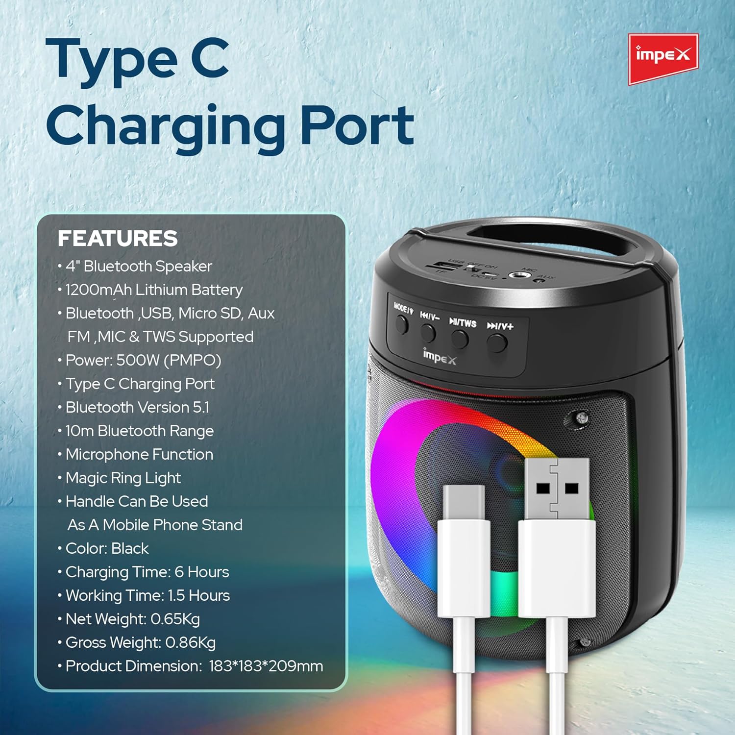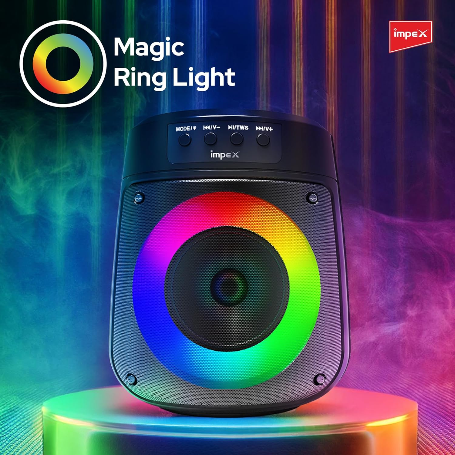 Impex Portable Bluetooth Speaker, 500W PMPO, 4″ Wireless Speaker with Magic Ring Light, 1200mAhBattery, Bluetooth 5.1, USB/Micro SD/AUX/FM/MIC/TWS, Type-C Charging,Wired Mic,10m Range, Black – TS 1106