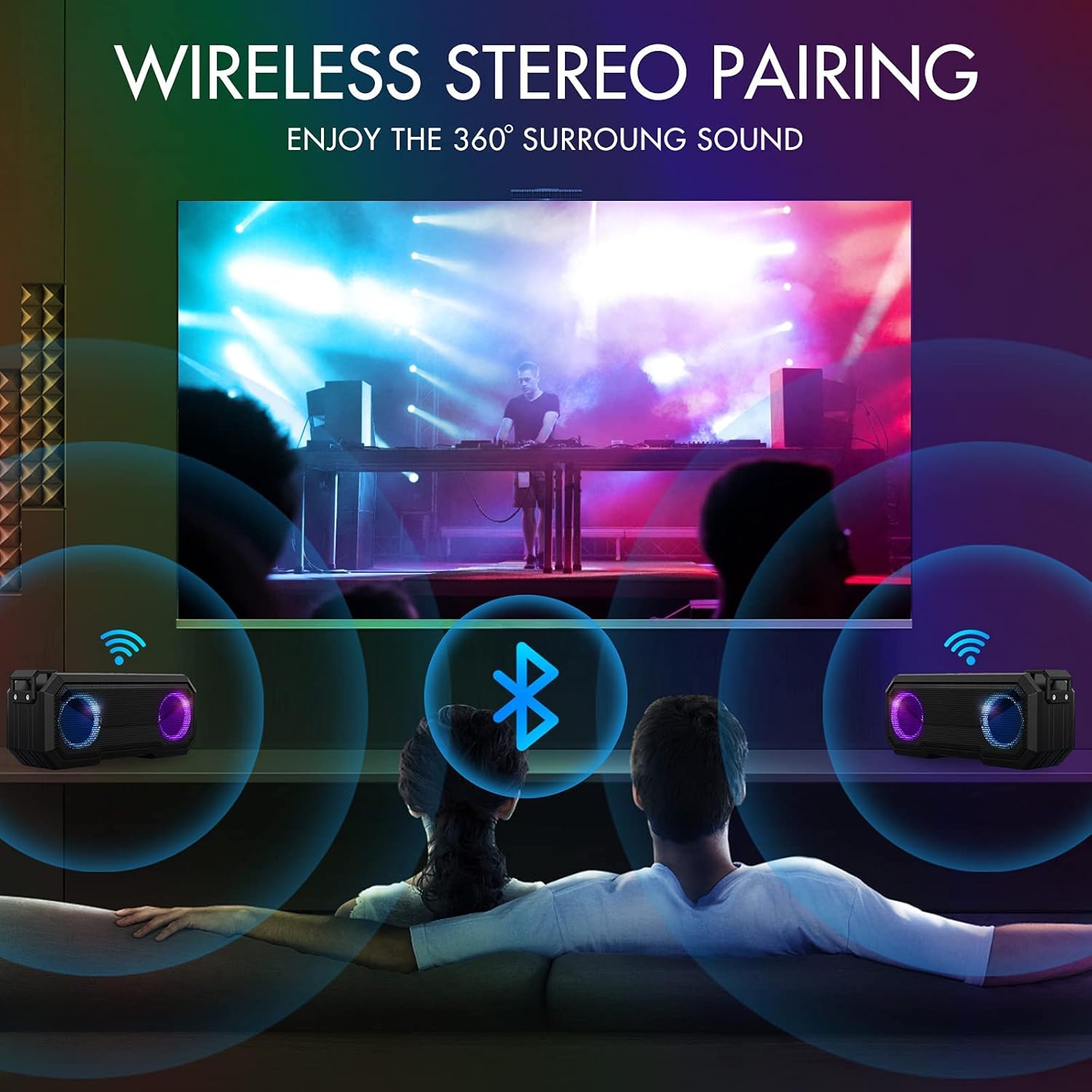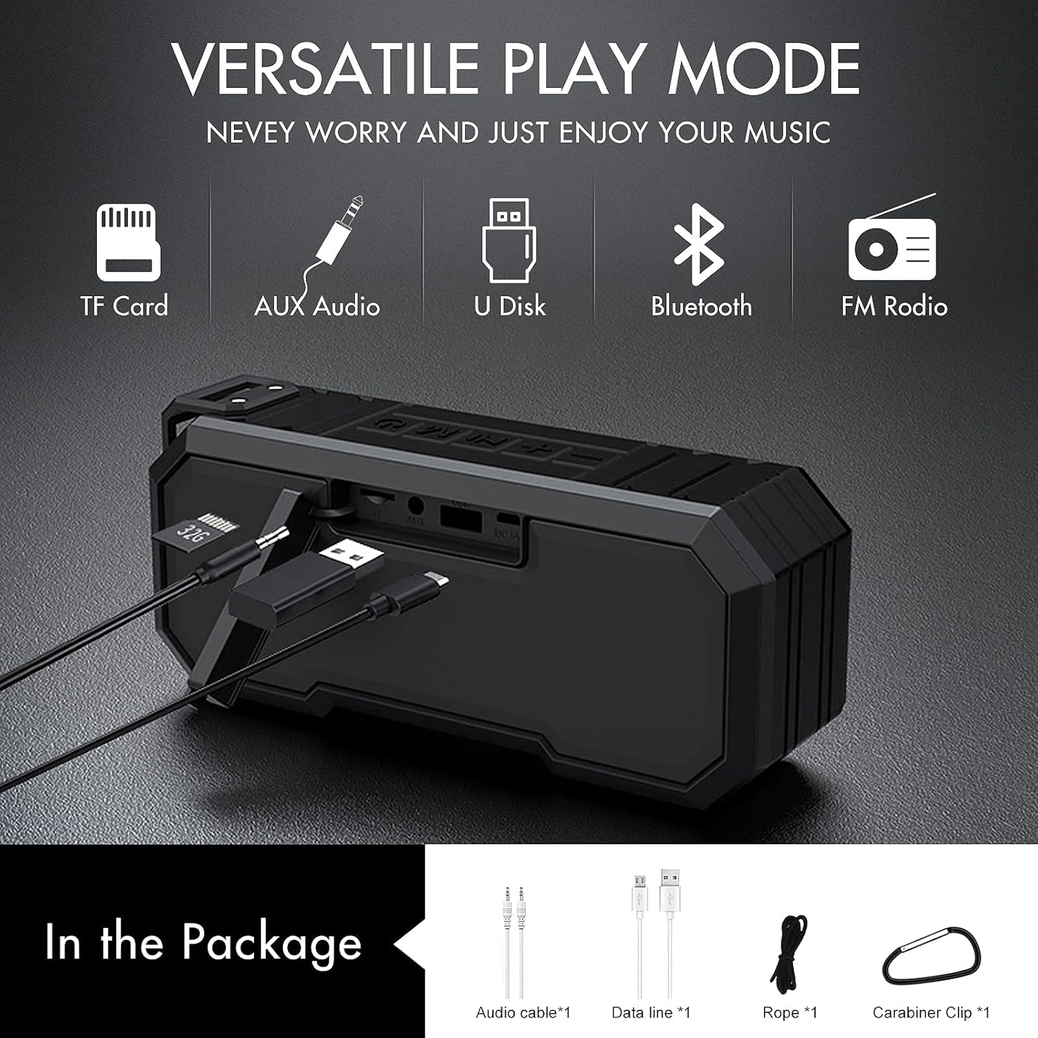 ♫【IPX7 Waterproof】IPX7 waterproof protection safeguards against rain, dust, snow, and spills, even the outdoor speaker can be fully immersed up to 30ft underwater. Perfect for showering, hiking, camping. No worries about weather and outdoor condition, be the Rocker on your trip.