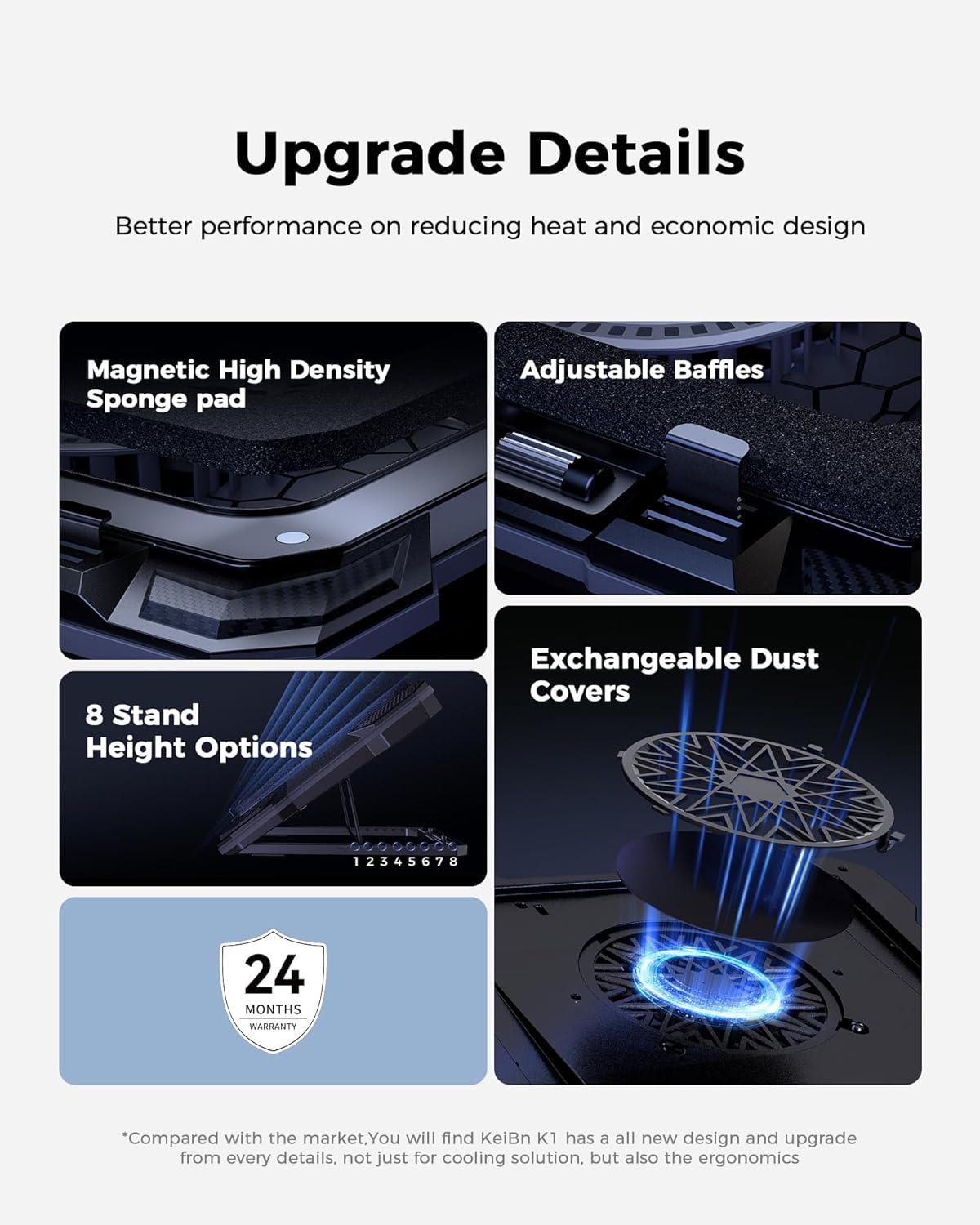 My KeiBn K1 cooling pad came with a critical missing part, which is the small stand that is supposed to prop up this cooling pad to allow sufficient airflow to the pad and onto the laptop. So, I had to use a small card to help prop up the stand for the time being until I get this resolved. Slightly disappointed that my new cooling pad arrived like this. Also, I wasn’t sure why the end of the stand had a missing (or maybe a wrongfully installed screw) at one end.On the plus side, at least the cooling pad works well. Dropped the temps down by at least 5°F to near 10°F while gaming when I have it set at around 1700-2000, which is a good spot until the unit starts getting excessively loud. The foam seals the bottom side of my 16″ Lenovo Slim 5 laptop really well allowing for efficient cooling. All the functions at least works as they should, though the speed control can be a little touchy, and the RGB feature is a nice touch. Sorry for the 3-stars in which otherwise I would have given it 5-stars had it not come with any missing parts.