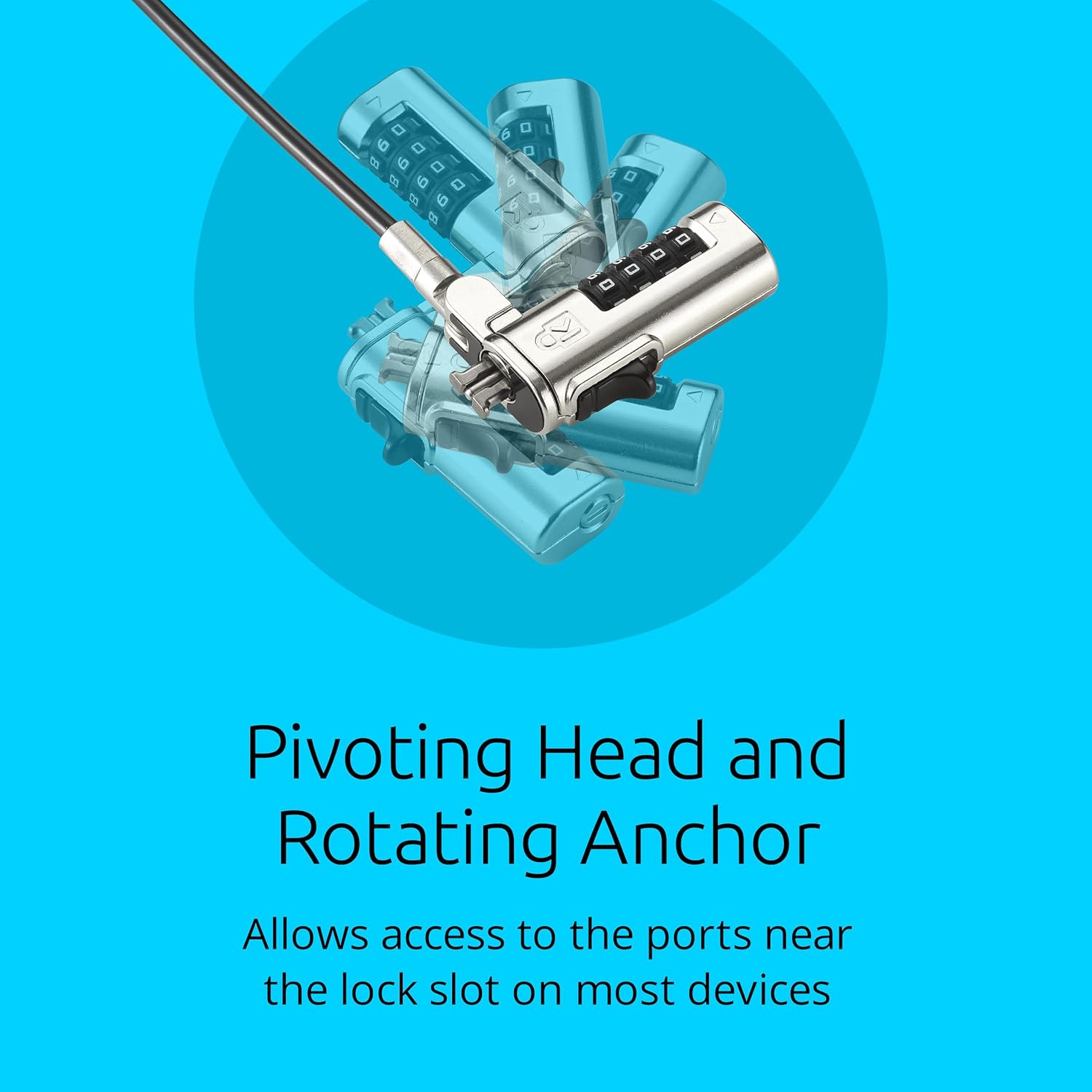 Pivoting Head and Rotating Anchor – The lock tip rotates 360º and the cable rotates up to 90º—allowing access to the ports near the lock slot on most devices and providing a convenient locking and unlocking experience