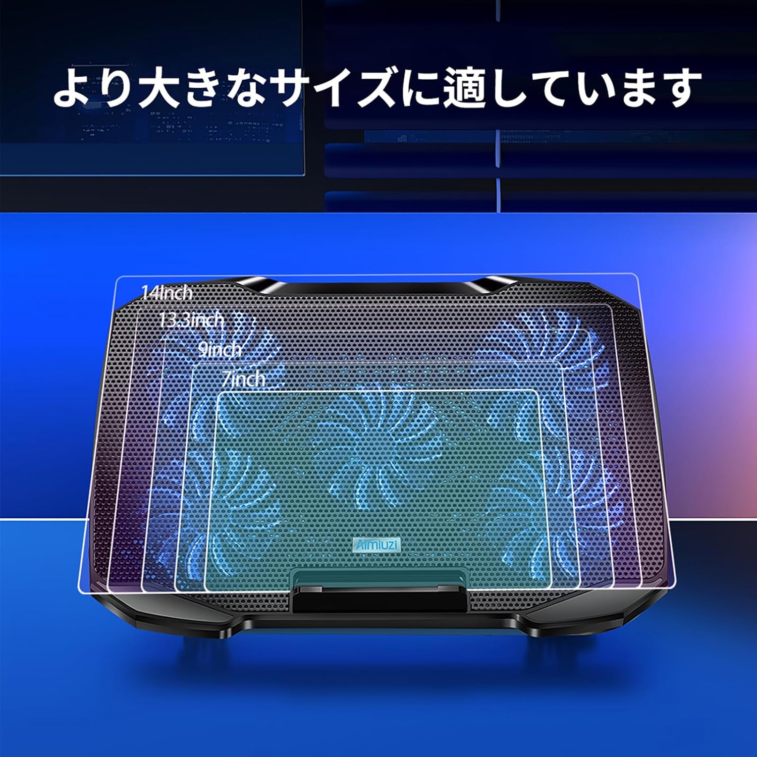 AIMIUZI laptop cooler is specially designed to cool down up to 15.6 inch laptops. Honeycomb style metal mesh, 1 small fan 4 big fans, flip-up anti-slip pad, 5 adjustable stand height settings, 2 USB ports, adjustable speeds, and USB powered.