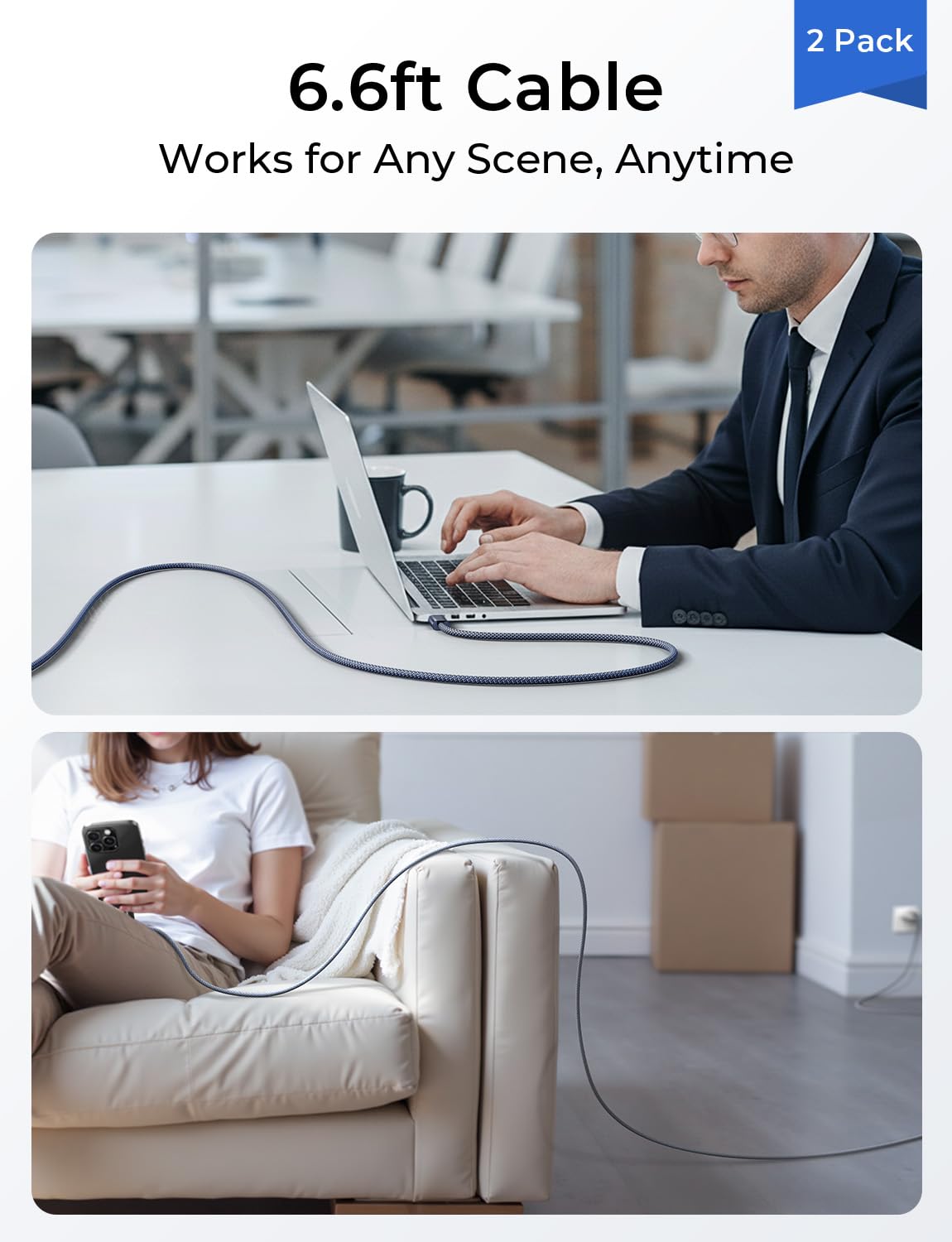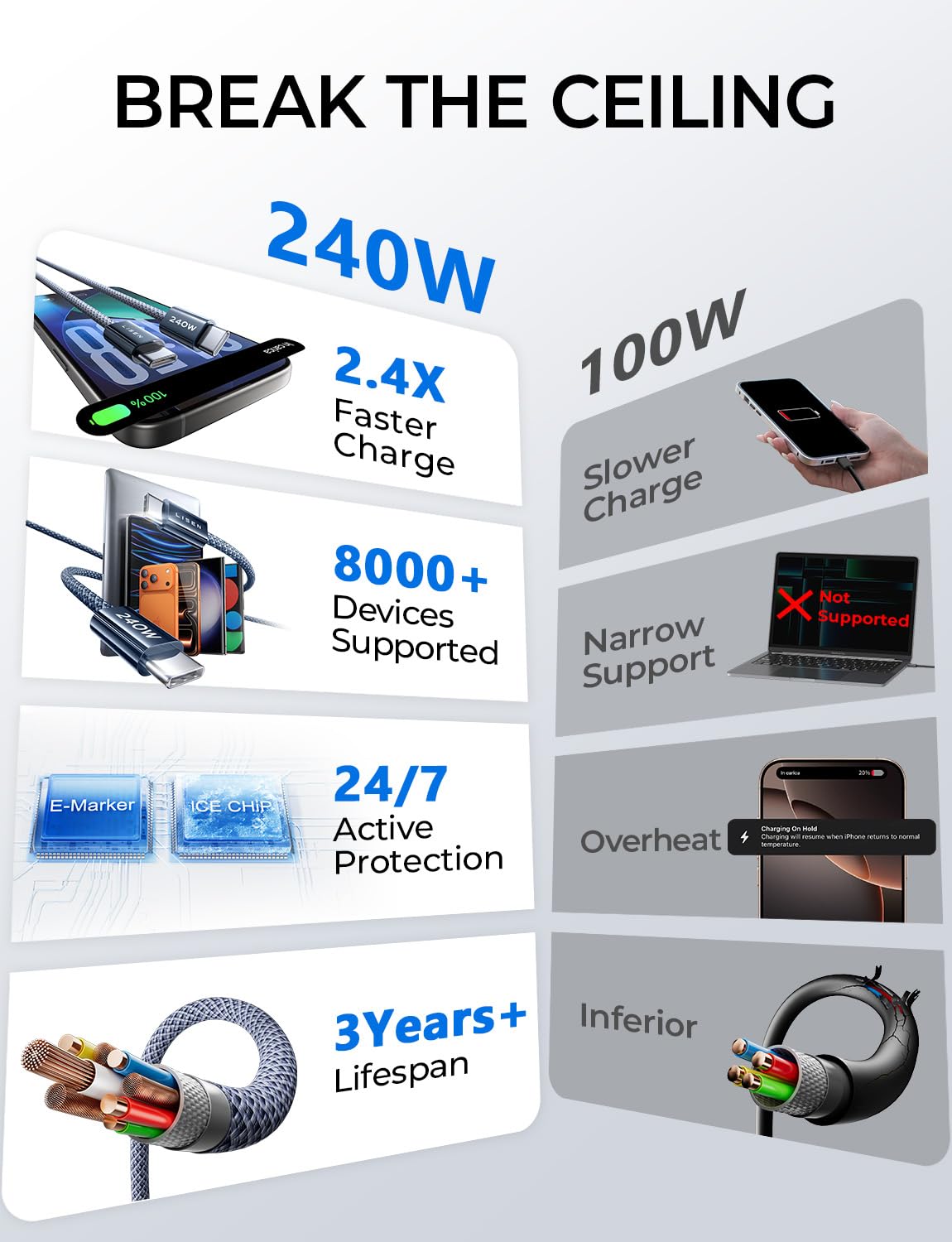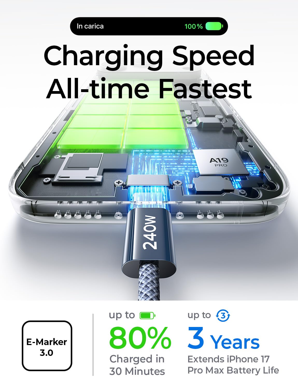 [240W Ultra Fast Charging | Smart Protocol Matching] This usbc to usbc cable upports PD3.1 EPR/QC4.0 fast charging up to 240W Max, working seamlessly with USB-C Power Delivery adapters (e.g.60W/100W/240W). It automatically matches your device’s handshake protocol to deliver the maximum safe power it can handle—no guesswork, just the fastest possible charge for each gear. It’s 2.4X faster than 100W fast charging usb-c cables: Up to 85% charged in 30 mins for iPhone 17 Pro Max, Up to 65% charged in 30 mins for iPad Pro M5, and up to 80% charged in 30 mins for MacBook Pro M5. This fast charging cord type c balances speed and protection perfectly, giving you both fast and secure charging