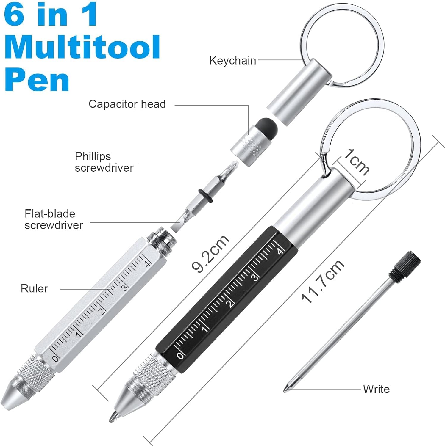 Functions: Phillips screwdriver, flat-blade screwdriver, touchscreen stylus, writing pen, keychain, ruler