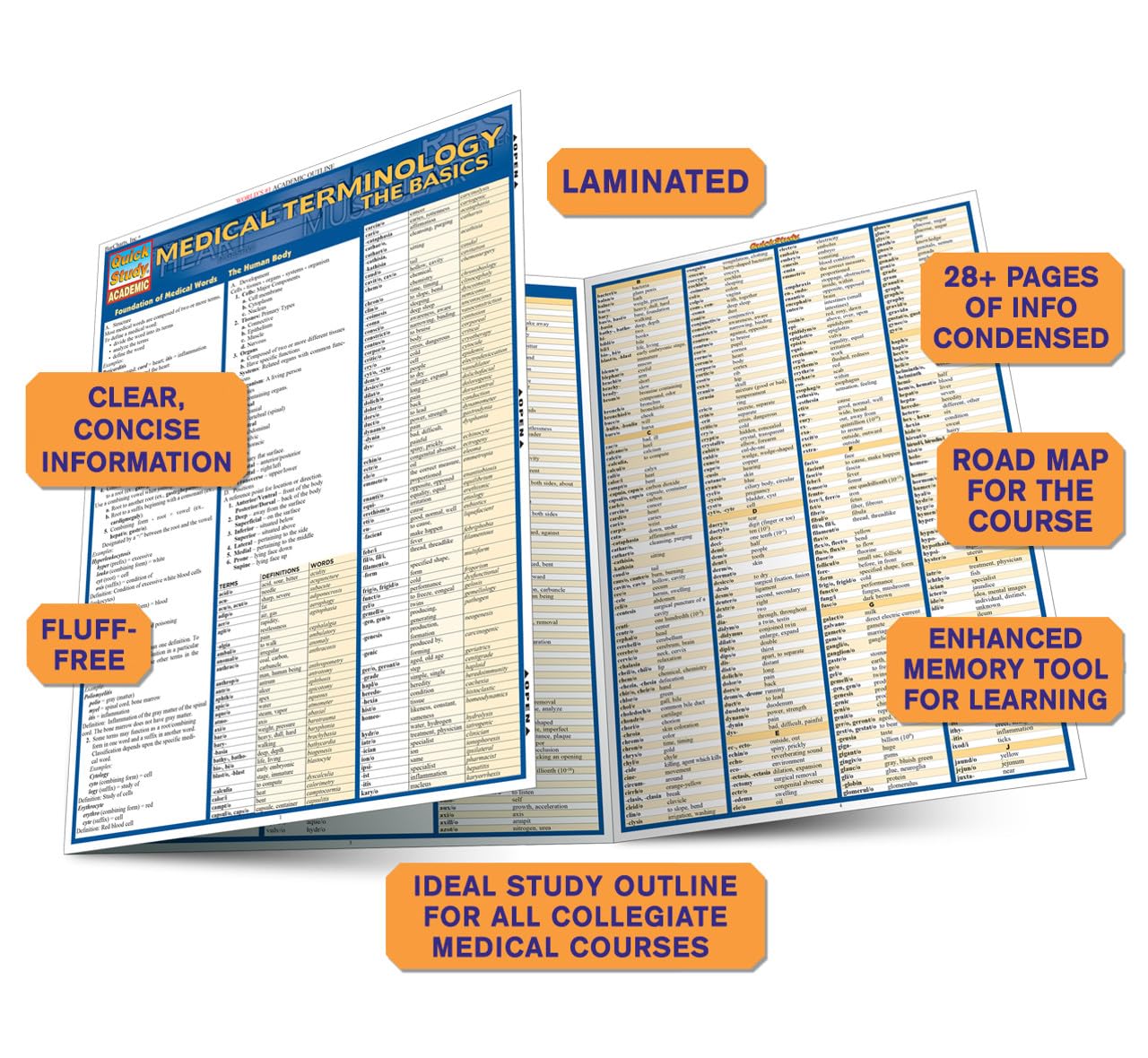 Essential terminology for study in any medically related field and a reference for professionals that can be stored and accessed quickly. Covering more terms per page than any book or website this six page laminated guide also covers the breakdown of medical words using the prefix, root, and suffix that will help decoding terms. Organized alphabetically and in color separated tables this tool for pre-med, nursing, EMT, imaging, pharmacology, medical coding and more has been a best-seller for twenty years with millions in print. Laminated for durability, this inexpensive reference can easily last a lifetime.