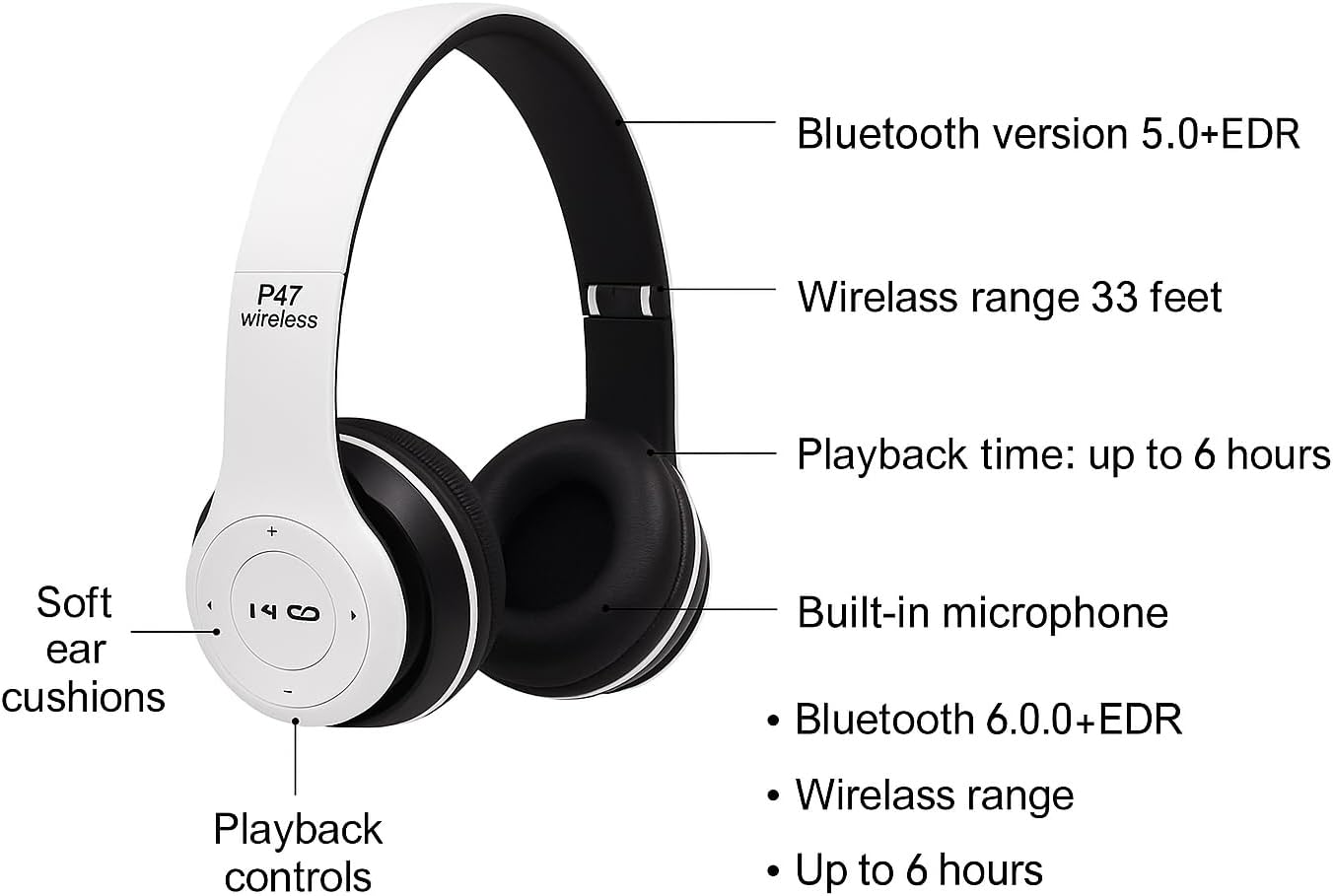 Multifunction and Foldable P47 Wireless over ear Headphones (White)