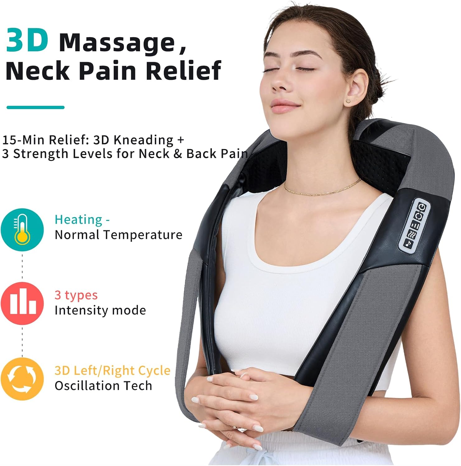 Heat Function, Overheat Protection: Our shoulder and neck massager has a heating function to gently warm the neck and shoulders, promoting relaxation. Neck massager are made of breathable fabric that promotes heat penetration and maximizes nodular massage. The massager heat will remain constant when the temperature reaches (113°F / 45°C). To ensures safety during use, preventing overheating, our back massager for pain relief also has a 15-minute automatic shut-off function to avoid overuse when falling asleep