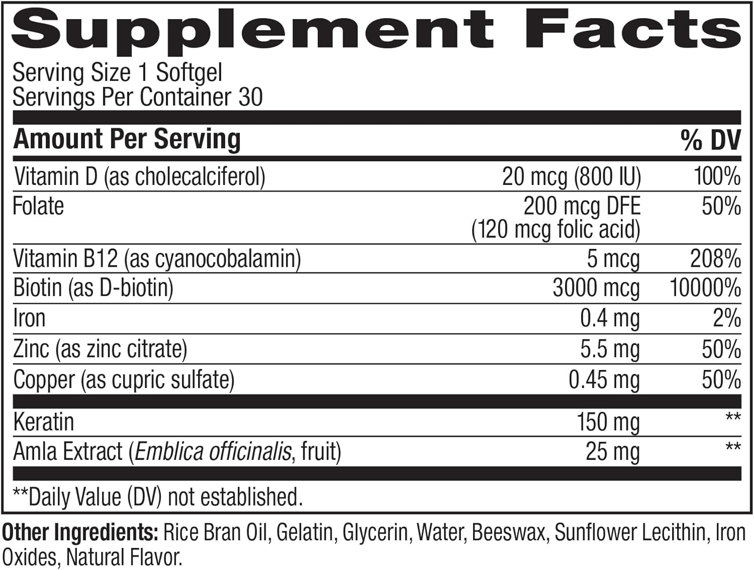 OLLY Ultra Strength Hair Softgels deliver a premium blend of essential Vitamins and Minerals for healthy hair from within.*A few highlights: Biotin helps your body metabolize fats and protein, and supports healthy hair and nails. A blend of key vitamins and minerals helps to support hair follicle health.* Plus Keratin and Amla, a botanical extract used for centuries in Ayuverdic tradition. For a delightful twist, these softgels have a hint of strawberry flavor. OLLY Ultra Strength softgels are gluten free, sugar free and easy to swallow. Don’t let their size fool you—these little softgels go big on benefits. *These statements have not been evaluated by the Food and Drug Administration. This product is not intended to diagnose, treat, cure or prevent any disease.