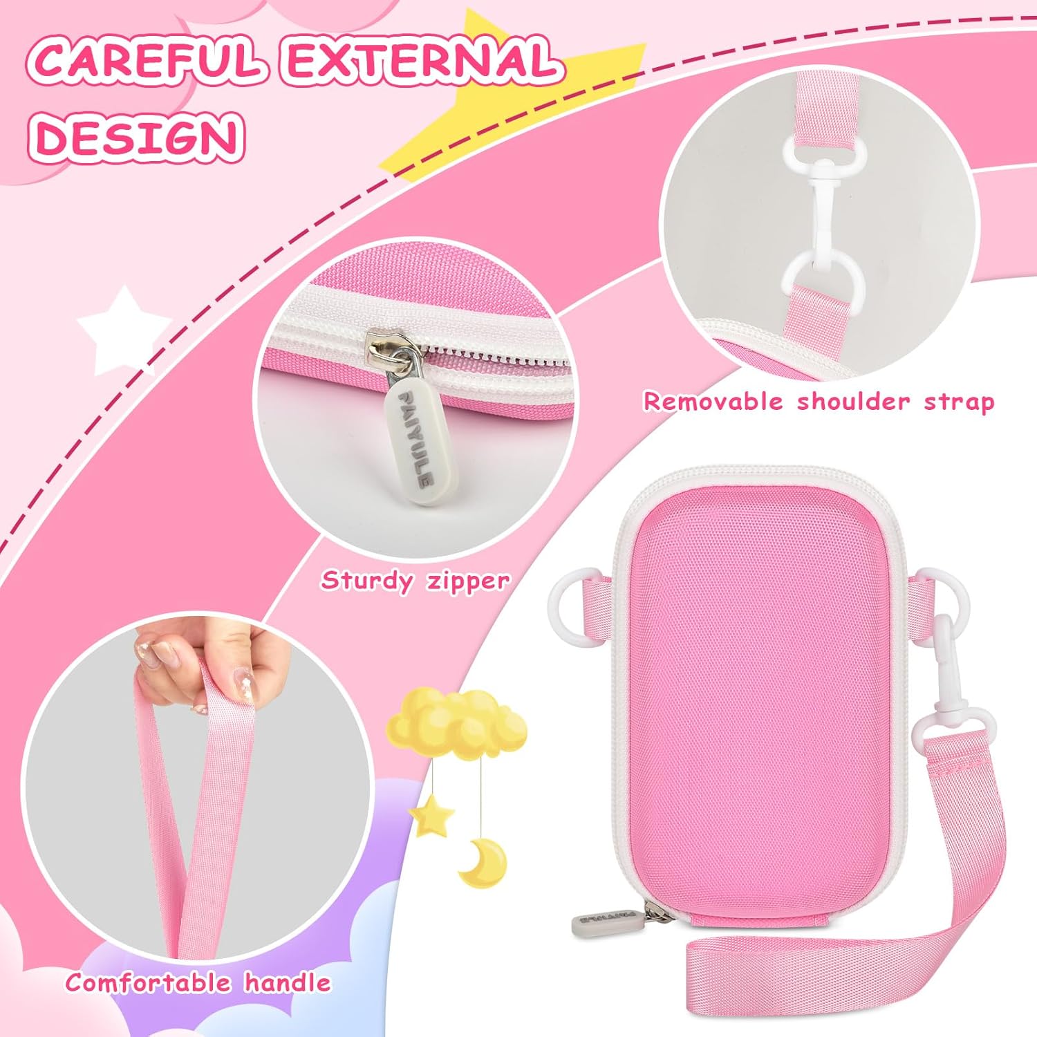 Toddler phone holder with easy access and organized carry: kids cell phone features a unique 270-degree zipper opening with an accordion-style (dual elastic straps) for effortless access to the phone while wearing the shoulder strap. Includes a detachable crossbody strap for hands-free carrying or convenient top-handle use. Secures the unicorn play phone for kid with an internal elastic safety strap