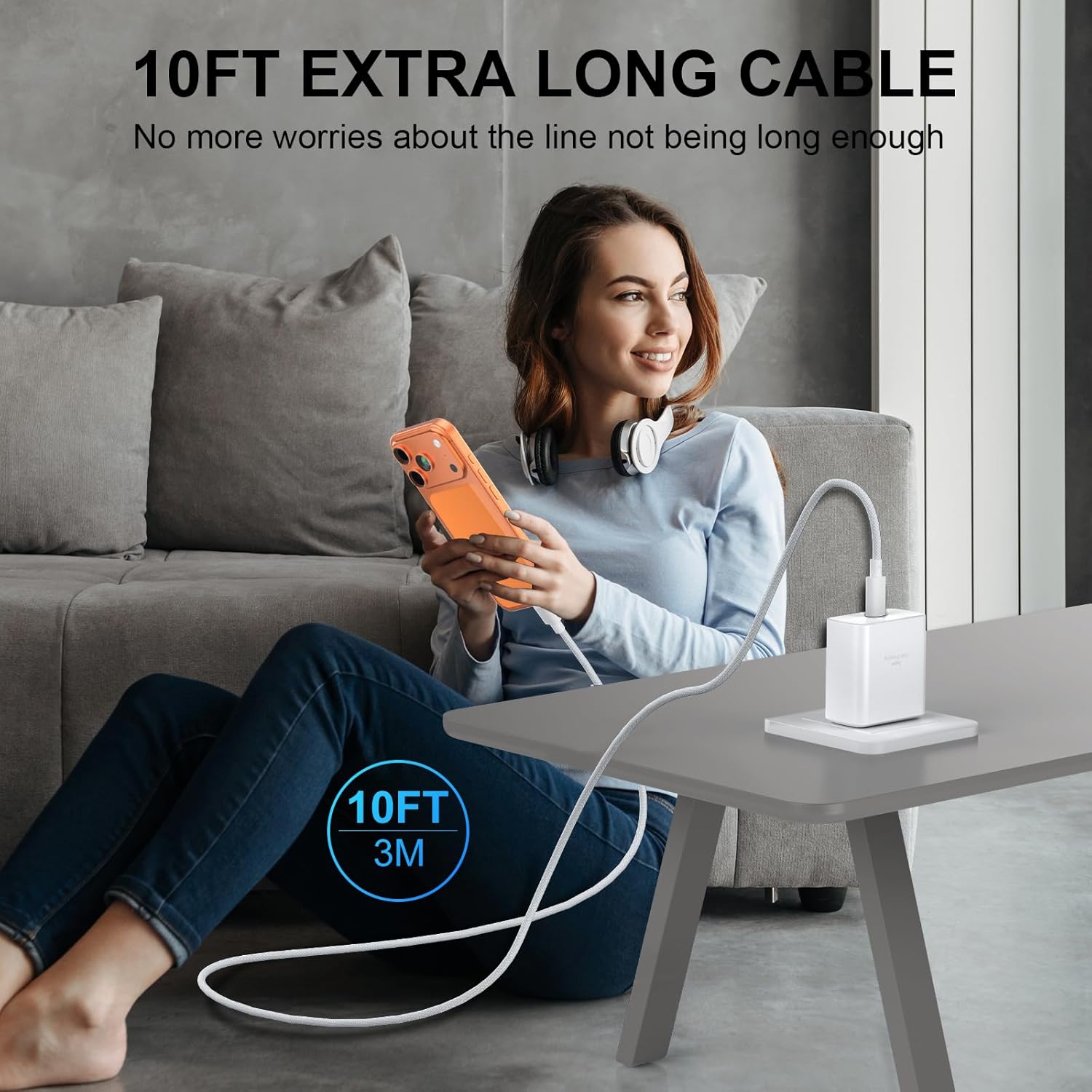 【10Ft USB C Phone 17 16 Charger Cable Cord】:The Phone 17 16 Pro Max Charger with 10 ft Long type c to c charging cable cord supports PD 3.0 fast charging speed max up to 20V/5A (100W), The cable’s reversible design allows for effortless plug-in, while enabling efficient 480Mbps data syncing. With its generous 10FT length, you’ll move your device around while keeping your device powered up.