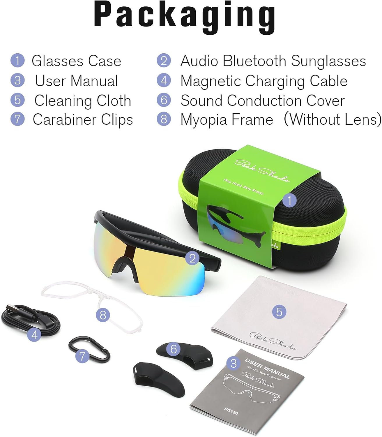 WIRELESS CONVENIENCE & COMPLETE KIT: Includes smart sunglasses, magnetic charging cable, glasses case, user manual, cleaning cloth, sound conduction covers, myopia frame and clip. These wireless Bluetooth glasses for men and women combine style, comfort, and tech for any outdoor activity.